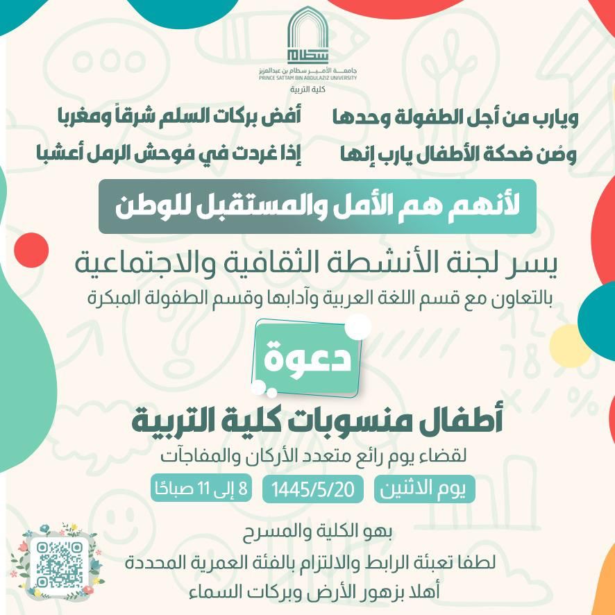 الطفولة تلك المرحلة العمرية التي يحمل الانسان في بقية عمره ذكرياتها، ففيها تكبر أحلامه وتستمر، يصنع فيها قادم أيامه بخطوط صغيرة لتكون حقيقته، ولأهمية هذه المرحلة خصصت منظمة الأمم المتحدة يوما عالميا للاحتفال بالطفولة تحت مسمى يوم الطفل العالمي، وقد حرصت كلية التربية على تفعيلة ممثلة بقسم الأنشطة الثقافية والاجتماعية بالتعاون مع قسم اللغة العربية آدابها وقسم الطفولة المبكرة صبيحة يوم الاثنين الموافق العشرون من شهر جماد الأولى لعام 1445هـ من خلال تنظيم مهرجان للطفولة.