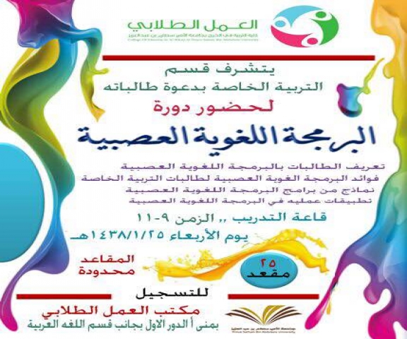 أقامت وحدة العمل الطلابي بكلية التربية بالخرج يوم الأربعاء الموافق 25/1/1438هـ -برعاية عميد الكلية الدكتور عبد الرحمن الرفدي- دورة بعنوان " البرمجة اللغوية العصبية " ألقتها الدكتورة/ فايزة إبراهيم أحمد من الساعة 9:00 حتى الساعة 11:00ص استهدفت فيها طالبات قسم التربية الخاصة بحضور (24) طالبة كما استهدفت الدورة إكساب الطالبات المهارات المختلفة لعلم البرمجة اللغوية العصبية من خلال المرجعيات النظرية والتطبيقية المعتمدة، ومجالات تطبيق هذا العلم في مجال التربية الخاصة والتعرف على فوائدها، واكتشاف أسرار النجاح لدى الطالبة بأسلوب البرمجة اللغوية العصبية والتفكير الإيجابي؛ حيث اشتملت على:-