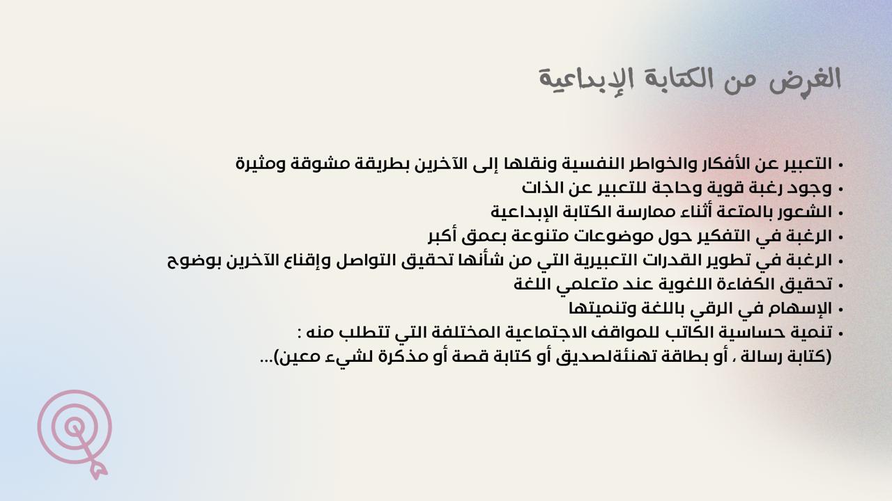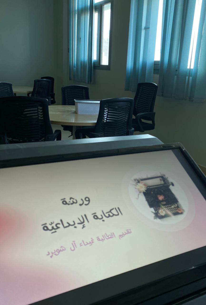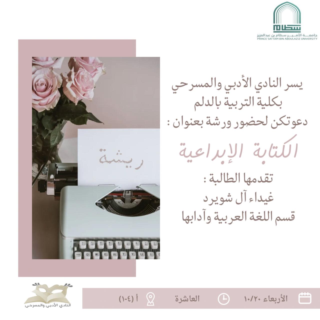 أقيمت ورشة الكتابة الإبداعية المقدمة من النادي الأدبي والمسرحي بكلية التربية بالدلم في يوم الأربعاء الموافق ١٤٤٤/١٠/٢٠ ، حيث قدمتها الطالبة غيداء بندر آل شويرد من قسم اللغة العربية وآدابها ، وكان الهدف منها تقديم فن الكتابة الإبداعية لطالبات الكلية ، والتعرف على ( مفهومها / أغراضها /خصائصها / مهاراتها / عناصرها …) بالإضافة إلى عرض بعض أقوال الكتّاب العرب والغرب عن الكتابة وختمت الورشة بجانب تطبيقي للكتابة الإبداعية من قبل الحاضرات ، وقدِم لهن قناة "ريشة" مجتمع للكاتبات المبدعات في الكليّة.