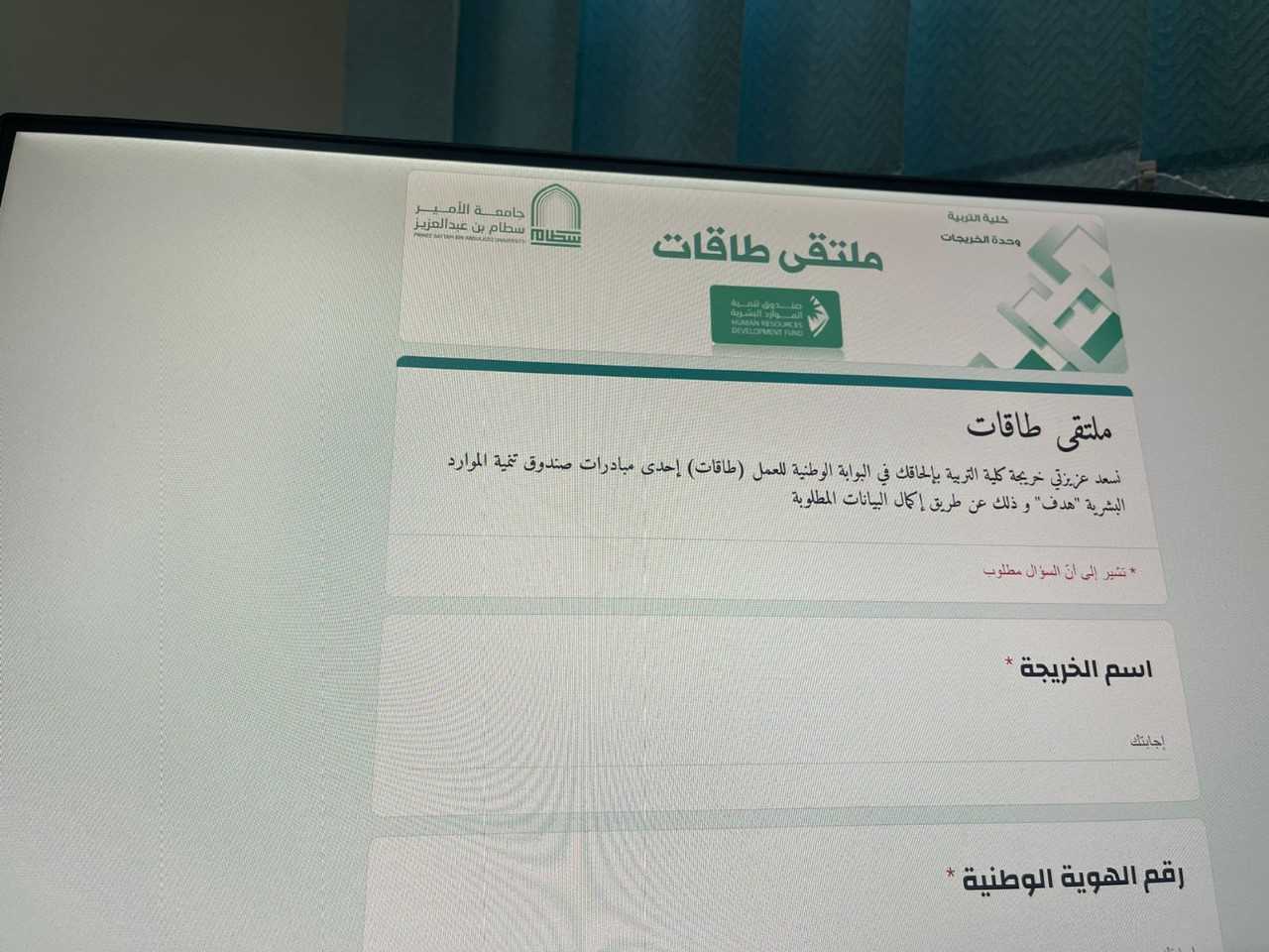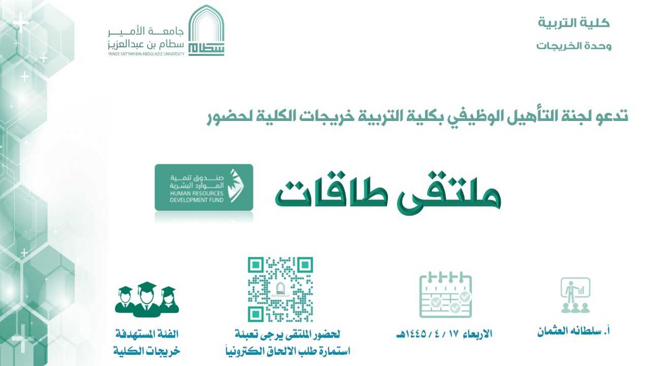 أقامت وحدة الخريجات ممثلة بلجنة التأهيل الوظيفي بكلية التربية ملتقى طاقات الذي يهدف إلى التعريف بالبوابة الوطنية للعمل (طاقات) وطريقة التسجيل والالتحاق. قدمته مستشارة التوظيف بالكلية سلطانه العثمان وذلك يوم الأربعاء الموافق 19/ ربيع الثاني/ 1445هـ عبر الزوم.