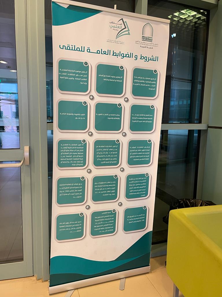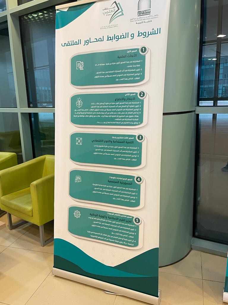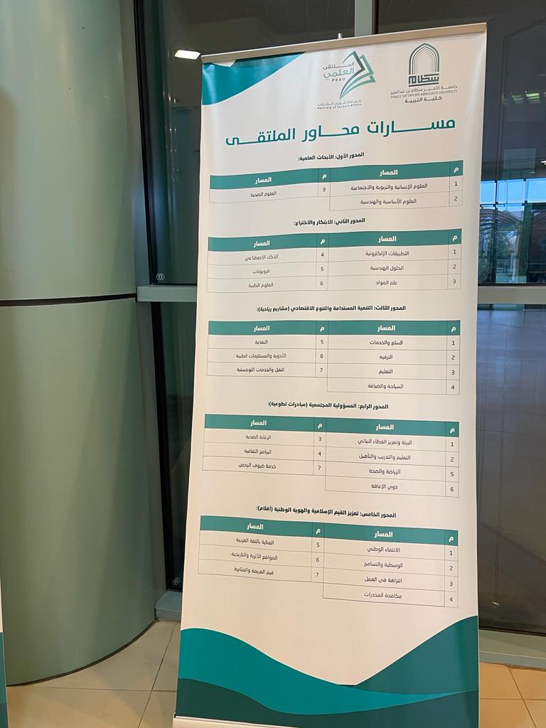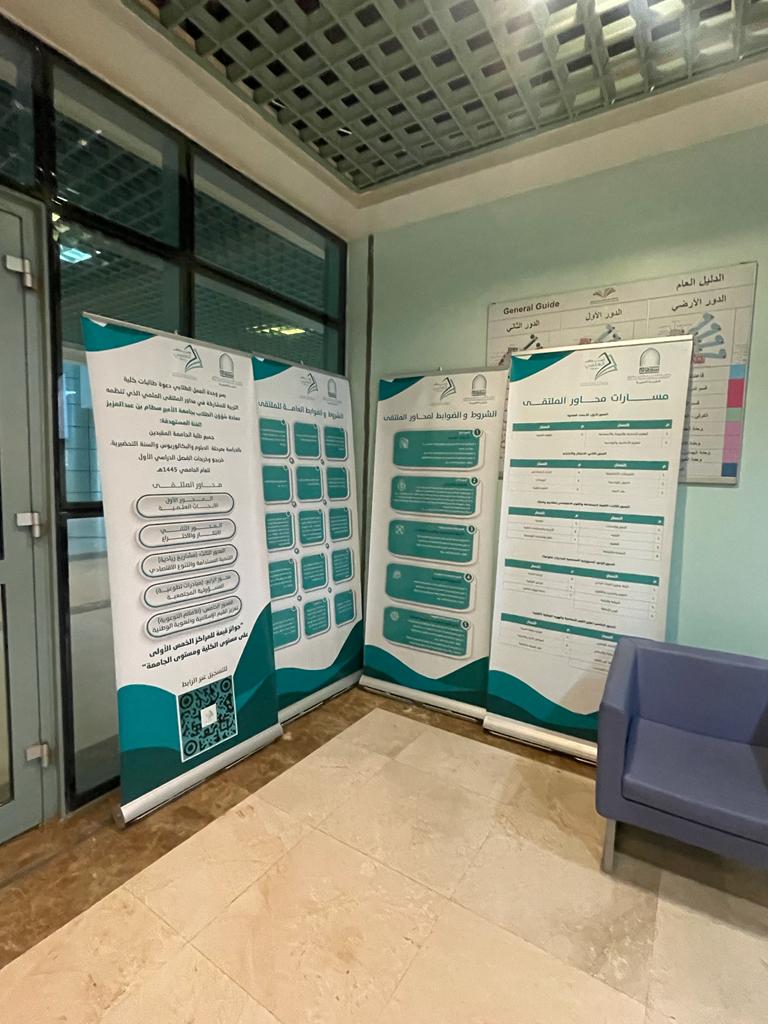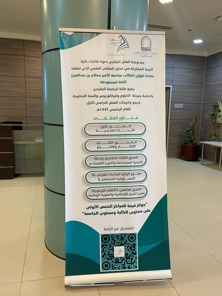 تسعى جامعة الأمير سطام بن عبدالعزيز إلى رفع مستوى روح المنافسة بين طلابها وطالباتها وذلك من خلال تنظيم العديد من المسابقات والملتقيات لذا حرصت عمادة الشؤون الطلاب على أن يكون الملتقى العلمي الطلابي حدثا استثنائيا يهدف إلى اكتشاف مواهب الطلبة في العديد من المحاور سواء في الأبحاث أو الابتكار أو المشاريع الريادية كذلك المبادرات التطوعية والأفلام التوعية التي تهدف إلى تعزيز القيم الإسلامية والهوية والوطنية وهذه الخمس تمثل محاور أساسية انطلق منها الملتقى لهذا العام وحرصا من وحدة العمل الطلابي بكلية التربية ممثلة في التنسيق للملتقى انطلقت المرحلة الأولى من الملتقى التحضيري والمتمثلة في الإعلان عن الملتقى ومحاور وشروطه وضوابطه من خلال استخدام وسائل مختلفة تمثلت في لوحات دعائية في مداخل الكلية الرئيسية وعبر وسائل التواصل الاجتماعي والوسائل العرض المرئية في الساحات والممرات والتي توفر كل المعلومات التي تحتاج إليها الطالبة حول الملتقى وتم إعداد دليل تعريفي خاص بطالبات الكلية مستلهم من الدليل الإجرائي الخاص بالملتقى والذي وضعته عمادة شؤون الطلاب، وتم تزويد الطالبات برابط خاص بالتسجيل كذلك رابط للدليل التعريفي ويسعى التنسيق للملتقى على مستوى كلية التربية للوصول إلى أكبر شريحة من الطالبات قبل انطلاق المرحلة الثانية المتمثلة في اللقاء التعريفي وتنظيم ورش ودورات تدريبية حول محاور الملتقى بمشاركة نخبة من أعضاء هيئة التدريس والطالبات.