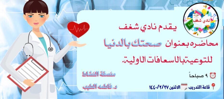 أقام نادي شغف بكلية التربية - الشطر النسائي دورة تدريبية بعنوان (صحتك بالدنيا) قدمتها د/ نجلاء محمود الطبيبة بعيادة كلية التربية بالخرج، يوم الإثنين 27-2-1440هـ، تحت إشراف وحدة العمل الطلابي. والتي تهدف للتعريف بأهمية الصحة في الحياة، وأنّها حالة من اكتمال السلامة البدنيّة والعقليّة والاجتماعيّة والرفاهيّة، والّتي تتمثّل في الحفاظ على الجسم قدر المستطاع باتّباع النصائح والتدابير الوقائية اليومية للتقليل من احتماليّة إصابته بالأمراض، وأن للصحّة دوراً مهماً في الشعور بالسعادة، فهناك العديد من الأشخاص ممّن يعانون من الأمراض الّتي تفقدهم الشعور بالراحة أو الاستمتاع بالحياة كأي إنسان طبيعي. والتعرف على بعض الإسعافات الأولية، والتعرف على المشكلات الصحية الشائعة. وبنهاية الدورة أعطت الطبيبة نصائح للحفاظ على الصحة العامة.