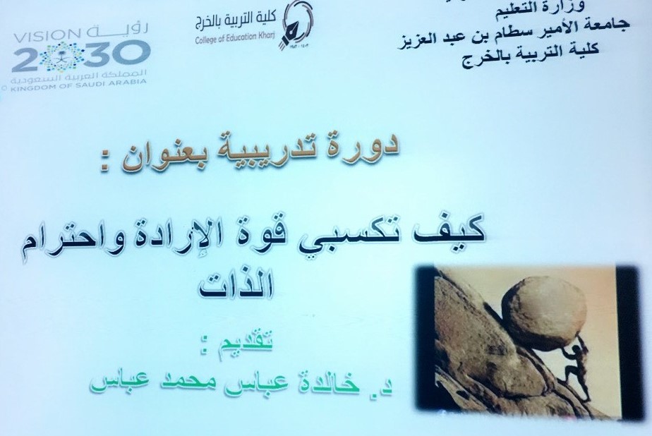 أقام قسم المناهج وطرق التدريس دورة تدريبية للطالبات بكلية التربية بالخرج - شطر الطالبات بعنوان (كيف تكسبين قوة الإرادة واحترام الذات) ، وذلك حرصا من القسم على تنفيذ سلسلة من الدورات التدريبية الموجهة للطالبات ، قدمتها د / خالدة عباس محمد أستاذ المناهج وطرق التدريس المساعد بالقسم بالتعاون مع وحدة العمل الطلابي ، وذلك يوم الأربعاء الموافق 22-2-1440 هـ بقاعة التدريب بالكلية ، وقد اختتمت الدورة التدريبية بالمشاركات والمناقشات الفعالة والمثمرة من قبل الطالبات.وكان الهدف من الفعالية تحليل مفهوم قوة الإرادة وتوضح أنواعها. وتبين العلاقة بين قوة الإرادة والثقة بالنفس، وكيف تكتسب قوة الإرادة، وشرح مظاهر ضعف الإرادة وتحليل مفهوم الذات وأنواع مفهوم الذات.