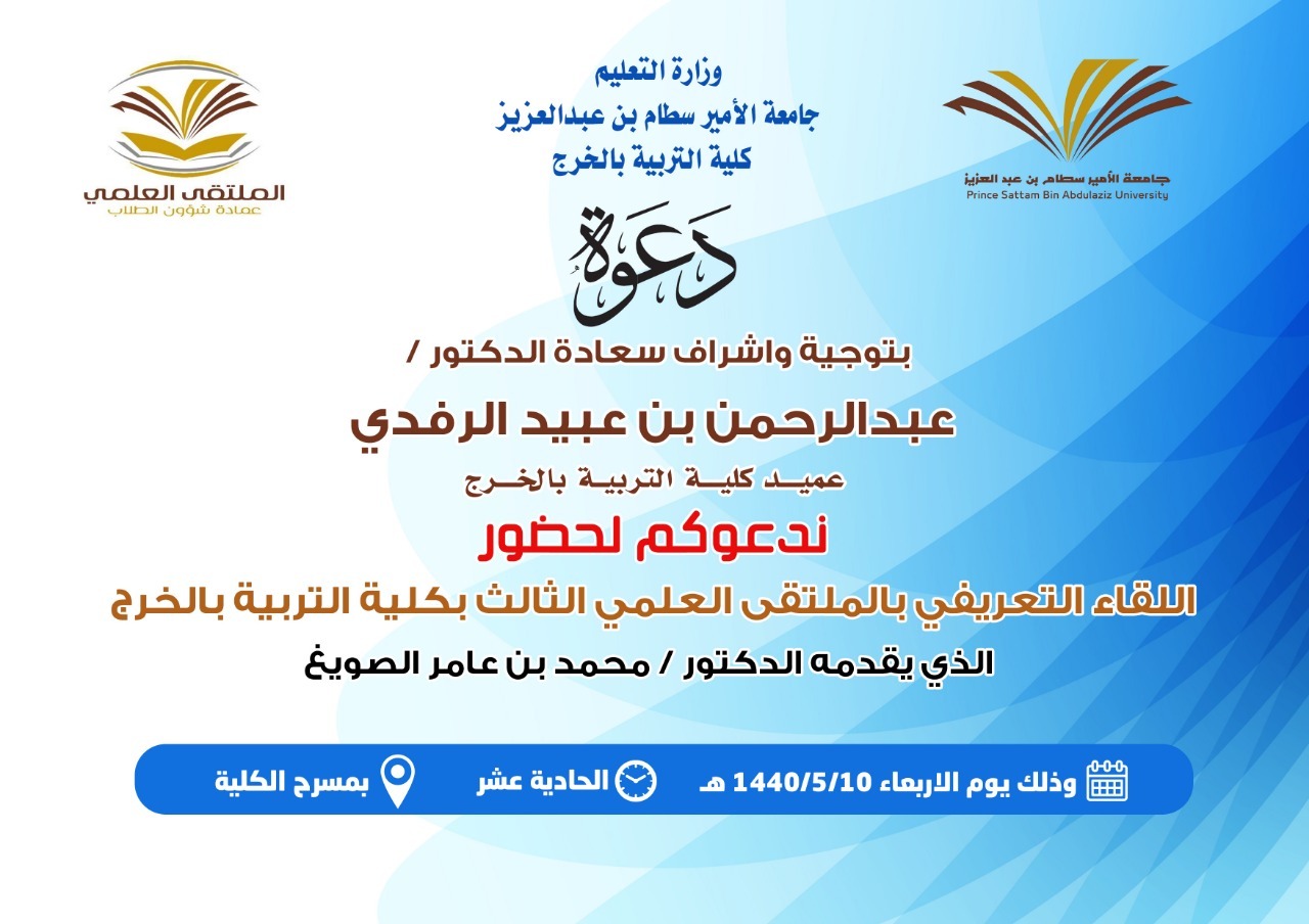 تنفيذاً لتوجيهات معالي مدير الجامعة الأستاذ الدكتور عبد العزيز بن عبد الله الحامد، وسعادة وكيل الجامعة للشئون التعليمية الأستاذ الدكتور عبد الرحمن بن إبراهيم الخضيري، وحضور سعادة عميد كلية التربية بالخرج الدكتور عبد الرحمن بن عبيد الرفدي، وأعضاء هيئة التدريس بالكلية والعديد من طلاب وطالبات الكلية وفي إطار خطة الأنشطة بالكلية، نظمت كلية التربية بالخرج يوم الأربعاء 10/5/1440هـ لقاءً تعريفياً بالملتقى العلمي الثالث ، د. محمد بن عامر الصويغ عرضاً تعريفاً بالملتقى، وأهدافه، والمحاور التي يتناولها، وطبيعة الفعاليات المصاحبة له، وهي مشاريع ريادة الأعمال، والخدمة المجتمعية، والإلقاء العربي، والأفلام الوثائقية، والمسابقات الفنية، كما تناول اللقاء أيضاً بياناً للشروط العامة للمشاركة في الملتقى والمرفقات المطلوبة، كما تطرق أيضاً إلى الحديث عن جوائز الفائزين، ومواعيد فعاليات الملتقى واللقاء الختامي، وتناول اللقاء أيضا الإجابة على تساؤلات واستفسارات الطلاب والطالبات بخصوص الملتقى.وفي نهاية اللقاء حث عميد كلية التربية بالخرج سعادة الدكتور/ عبد الرحمن بن عبيد الرفدي طلاب وطالبات الكلية على المشاركة في هذا الملتقى العلمي الهام، وضرورة المساهمة في تميز مشاركة الكلية، والاستفادة مما توفره الجامعة للطلاب والطالبات من دعم، وأن يدركوا مدى أهمية المشاركة في هذا الملتقى وما فيها من رفع لمستوى علمهم وثقافتهم، وتطوير لمهاراتهم البحثية والإبداعية.