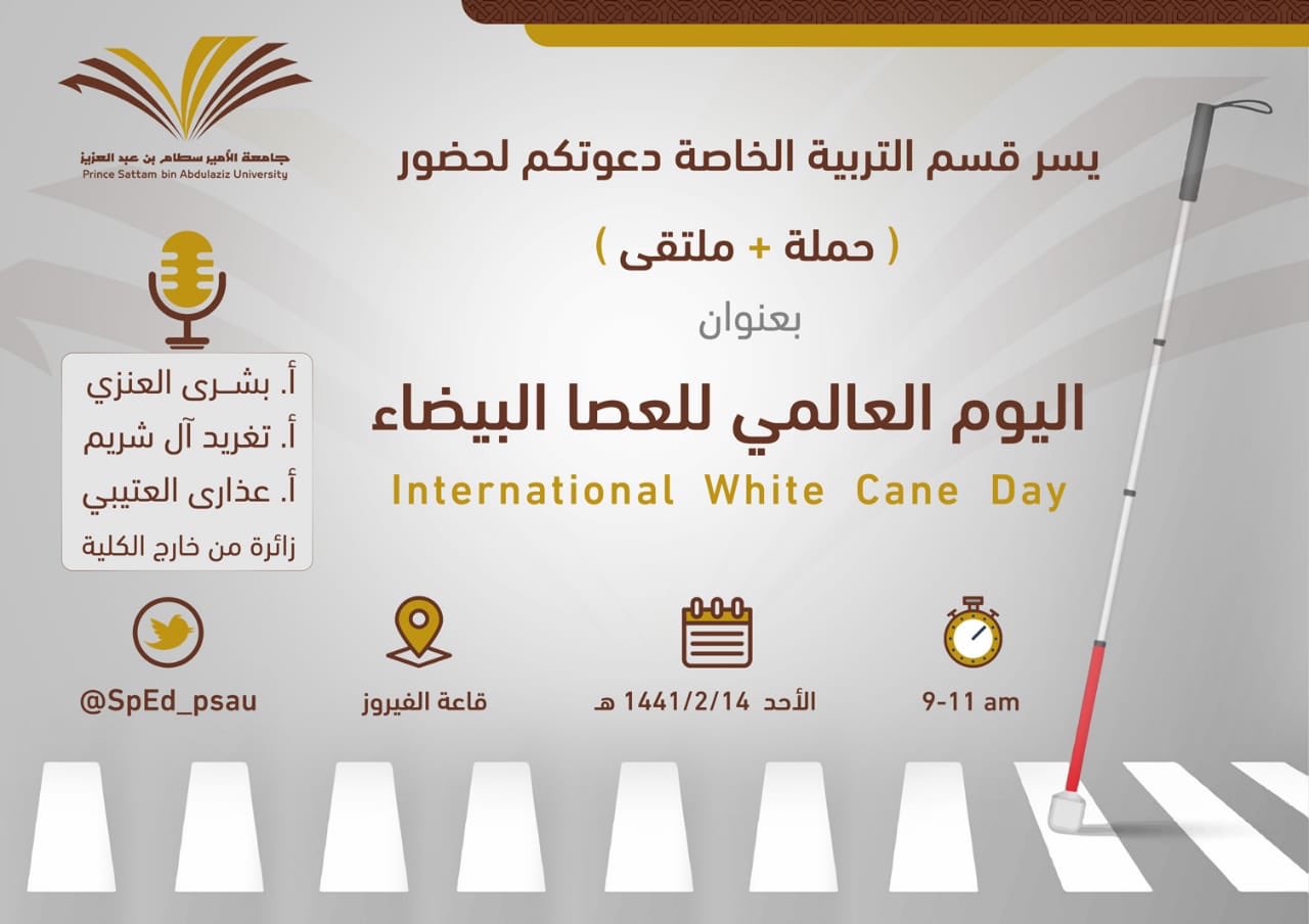 أقامت وحدة العمل الطلابي بكلية التربية بالخرج ممثلة بقسم التربية الخاصة فعالية "اليوم العالمي للعصا البيضاء للمكفوفين " في يوم الأحد الموافق ١٤/ ٢ / ١٤٤١هـ ، وقد هدفت الفعالية إلى تحقيق عدد من الأهداف منها تعريف المجتمع بمفهوم العصا البيضاء ، التعريف بحقوق الأشخاص من ذوي الإعاقة في جميع المجالات ، الدعم النفسي والاجتماعي لمن لديهم فئة من ذوي الاعاقة البصرية، التوعية عن البرامج التربوية والتأهيلية الخاصة بهم. للإطلاع على الخبر ، اضغط الرابط التالي :
