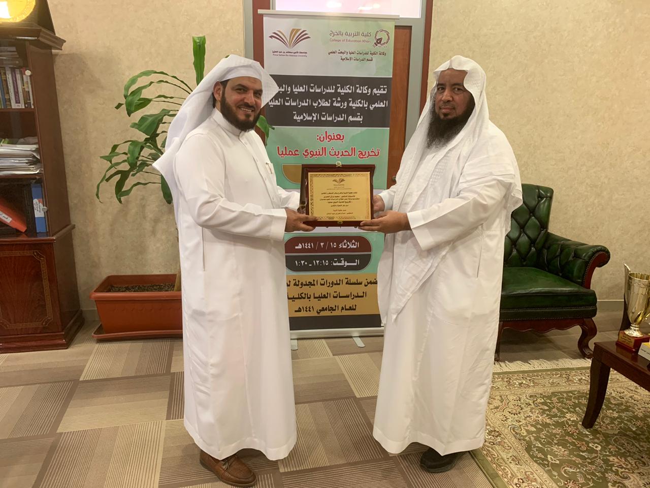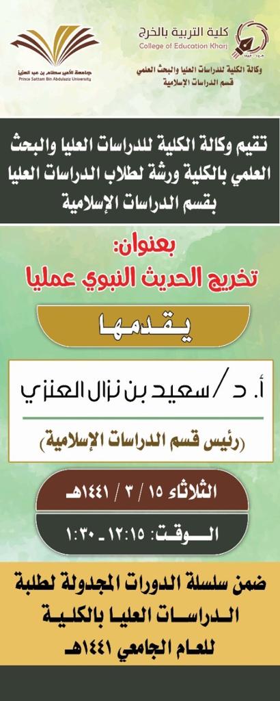 أقامت وكالة الكلية للدراسات العليا والبحث العلمي ورشة عمل لطلاب الدراسات العليا بقسم الدراسات الإسلامية بعنوان "تخريج الحديث النبوي عملياً"، قدمها أ.د. سعيد بن نزال العنزي (رئيس قسم الدراسات الإسلامية) يوم الثلاثاء 1441/3/15هـ ضمن سلسلة الدورات المجدولة لطلبة الدراسات العليا بالكلية للعام الجامعي 1441هـ.