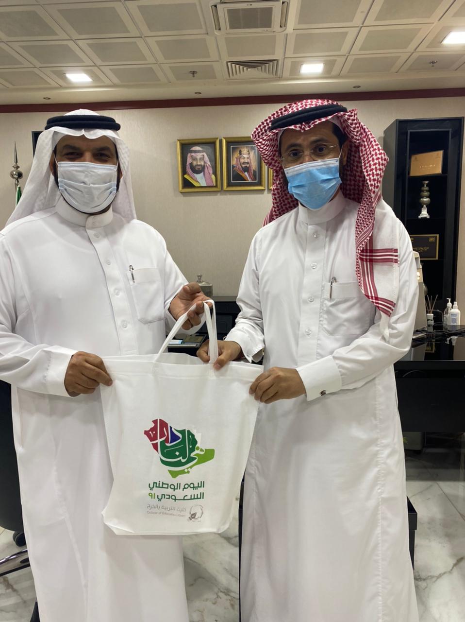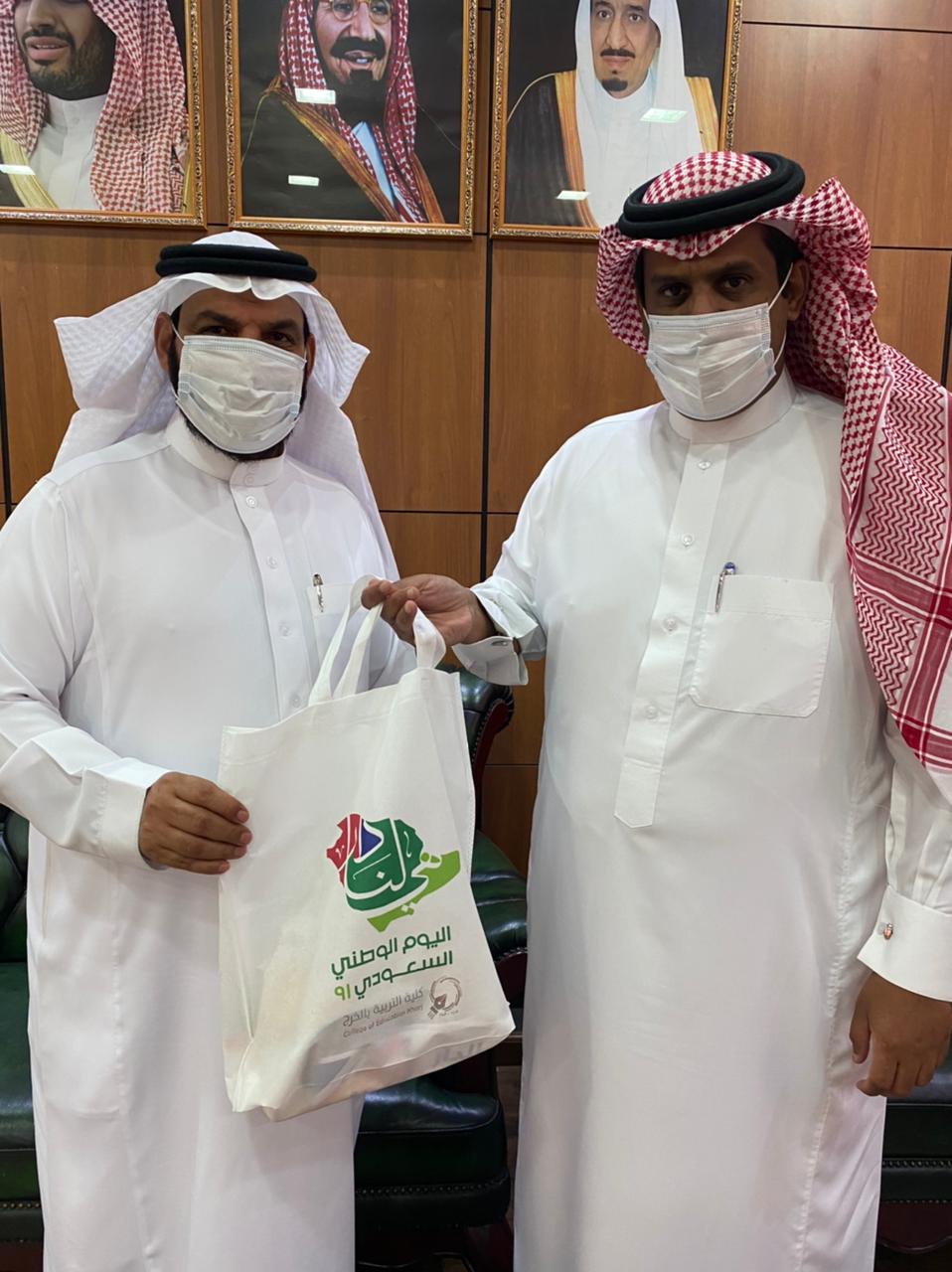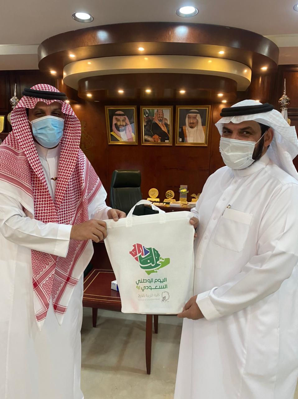 وفي ختام الزيارة قام سعادة الدكتور عبد الرحمن الرفدي عميد كلية التربية بالخرج بتسليم قيادات الجامعة هدايا الكلية بمناسبة تلك الذكرى الوطنية الغالية.