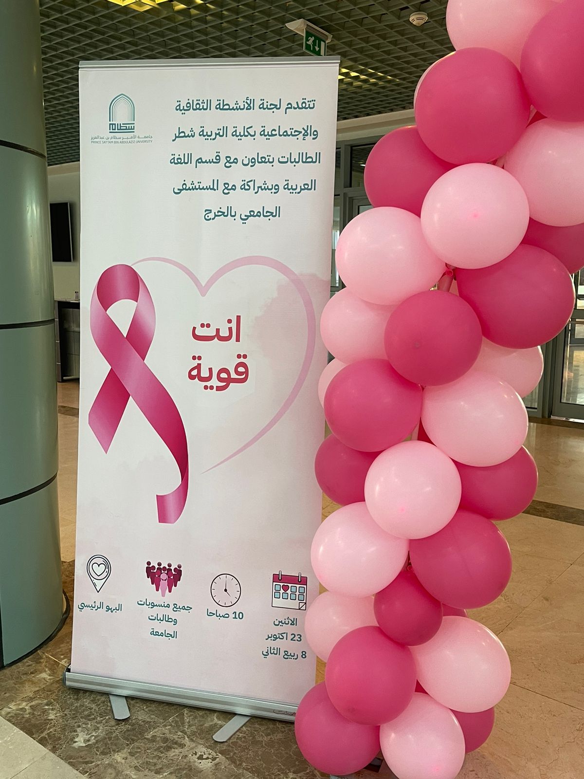 أَقرت منظمة الصحة العالمية بأن يكون شهر أكتوبر من كل عام مخصصاً للتوعية والتثقيف بمرض سرطان الثدي والذي يعتبر القاتل رقم واحد للنساء حول العالم، حيث بلغت إحصائية عام 2022م (63000) لذا أطلقت كلية التربية بجامعة الأمير سطام بن عبد العزيز ممثلةً في لجنة الأنشطة الثقافية والاجتماعية ولجنة الأنشطة بقسم اللغة العربية ووحدة العلاقات العامة حملة توعوية تثقيفية بالتعاون مع مستشفى الأمير سلمان بن محمد بالدلم والمستشفى الجامعي.