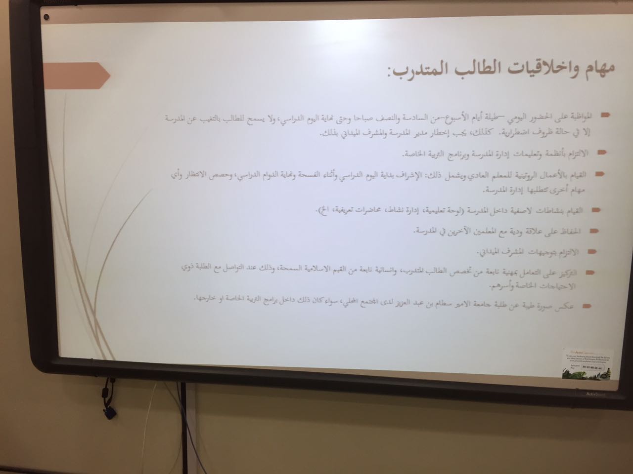 التقت لجنة التدريب الميداني بقسم التربية الخاصة بكلية التربية طلاب التربية الميدانية، مساري الإعاقة الفكرية وصعوبات التعلم، يوم الثلاثاء الموافق 17-5-1438، والذي تجاوز عددهم الـ 55 طالبًا في الفصل الدراسي الثاني لهذا العام. وقد قدمت اللجنة محاضرة تعريفية للطلاب، تضمنت أهمية التدريب الميداني ودوره المحوري في العملية التعليمية، ومتطلبات التخرج وأخلاقيات المهنة، وأنظمة العمل في التعليم العام. كما تضمنت المحاضرة أيضًا مراجعة شاملة لدليل التربية الميدانية بالقسم والذي تم توزيع نسخة منه على الطلاب، وفي نهاية اللقاء تم إيضاح المتطلبات الرئيسية والمهمات المطلوبة من الطلاب في أثناء التدريب الميداني، وعرض مشرفو التدريب الميداني تجارب بهذا الشأن وتمت الإجابة على استفسارات الطلاب.