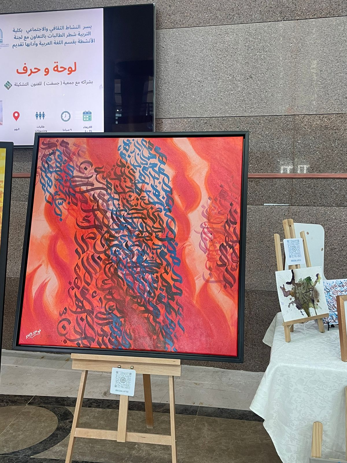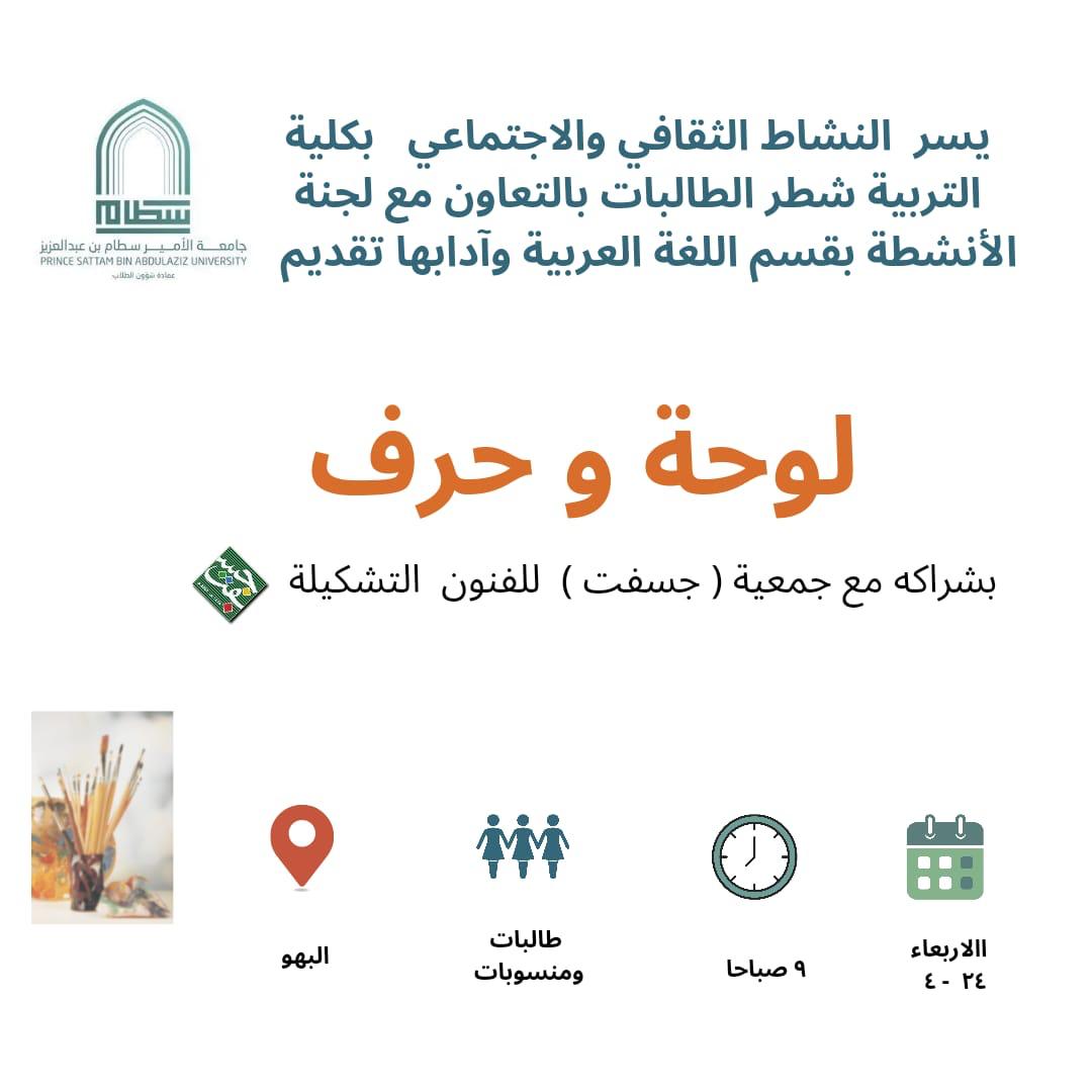 تتعارف الشعوب وتتميز بفنونها وآدابها وتعتبر من الموروثات التي تنتقل عبر الثقافات والمعارف من جيل إلى آخر، وقد شِهد التاريخ العربي تنوع في الآداب والفنون على مر عصوره منذ العصر الجاهلي إلى العصر الحديث حاملا في طياته العديد من الأسماء لشعراء وأُدباء سطروا أجمل الأبيات والكلمات، وفي وقتنا الحاضر امتزجت الألوان لترسم لوحة مشاعر معبرة عن دواخل الإنسان وخباياه ومن هذا المنطلق نظمت وحد العمل الطلابي ممثلة في قسم الأنشطة الثقافية والاجتماعية بالتعاون مع لجنة الأنشطة بقسم اللغة العربية وآدابها وبشراكة متميزة مع جمعية جسفت معرض بعنوان ( لوحة وحرف ) وذلك صباح يوم الأربعاء الموافق 24/4/1445هـ في البهو.