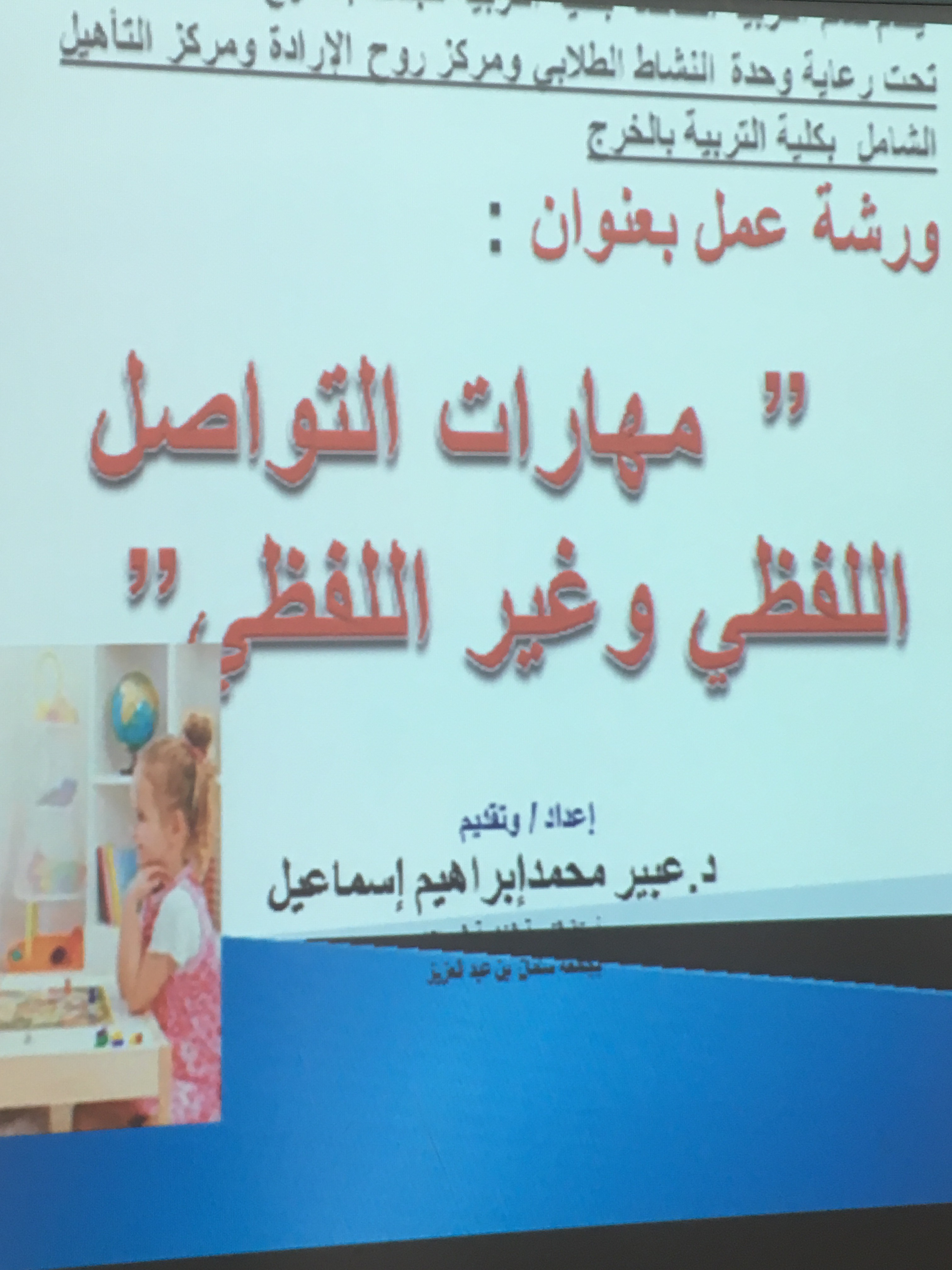 قدم قسم التربية الخاصة بالتعاون مع وحدة العمل الطلابي ورشة تدريبة لطالبات قسم التربية الخاصة بعنوان(مهارات التواصل اللفظي وغير اللفظي لذوي الاحتياجات الخاصة) للدكتورة/عبير محمد إسماعيل.وبحضور معلمات من مراكز إعاقة في الخرج هي(مركز التأهيل الشامل، ومركز روح الإرادة).وتهدف الدورة إلى بناء منظور متكامل لمهارات التواصل مع ذوي الاحتياجات الخاصة.ويتوقع في نهاية الدورة أن تحقق عدة أهداف كمعرفة التواصل والعناصر الأساسية للتواصل وأهدافه، ومهارات التواصل اللفظي وغير اللفظي، والتدريب على مهارات التواصل اللفظي وغير اللفظي وتطبيقاتها، وتستهدف الدورة طالبات قسم التربية الخاصة ومعلمات مراكز الإعاقة في الخرج وقد كان عدد الحضور (42)طالبة ومعلمة.