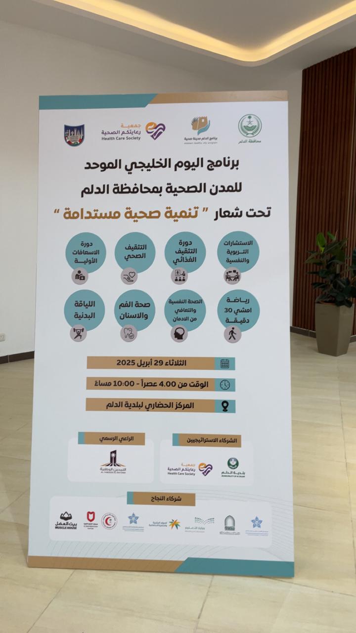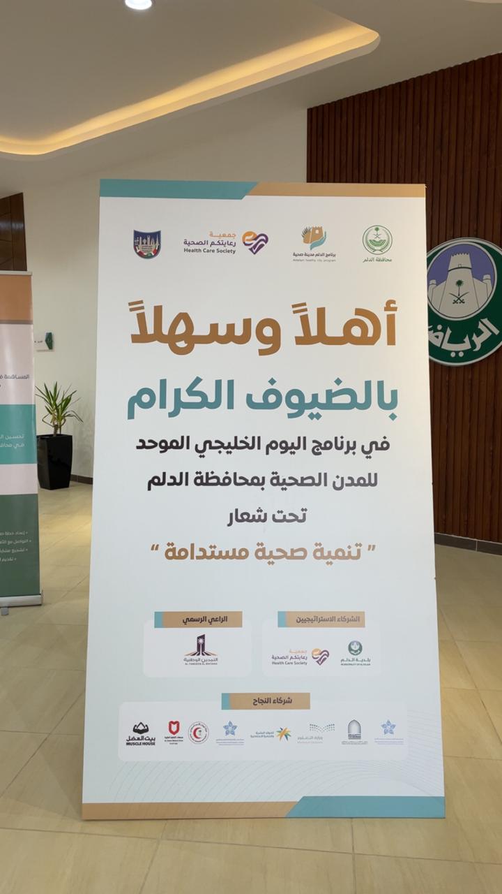 شاركت جامعة الأمير سطام بن عبد العزيز ممثلة في كلية التربية بفعاليات اليوم الخليجي الموحد للمدن الصحية بمحافظة الدلم تحت شعار "تنمية صحية مستدامة"، في المركز الحضاري التابع لبلدية محافظة الدلم برعاية كريمة من سعادة محافظ الدلم الأستاذ/ فهد بن سلطان بن حميد، وذلك في يوم الثلاثاء الموافق 29/4/2025م، ومثلت الكلية في المشاركة بالفعاليات نخبة من عضوات هيئة التدريس بقسم الاقتصاد المنزلي، وهن: