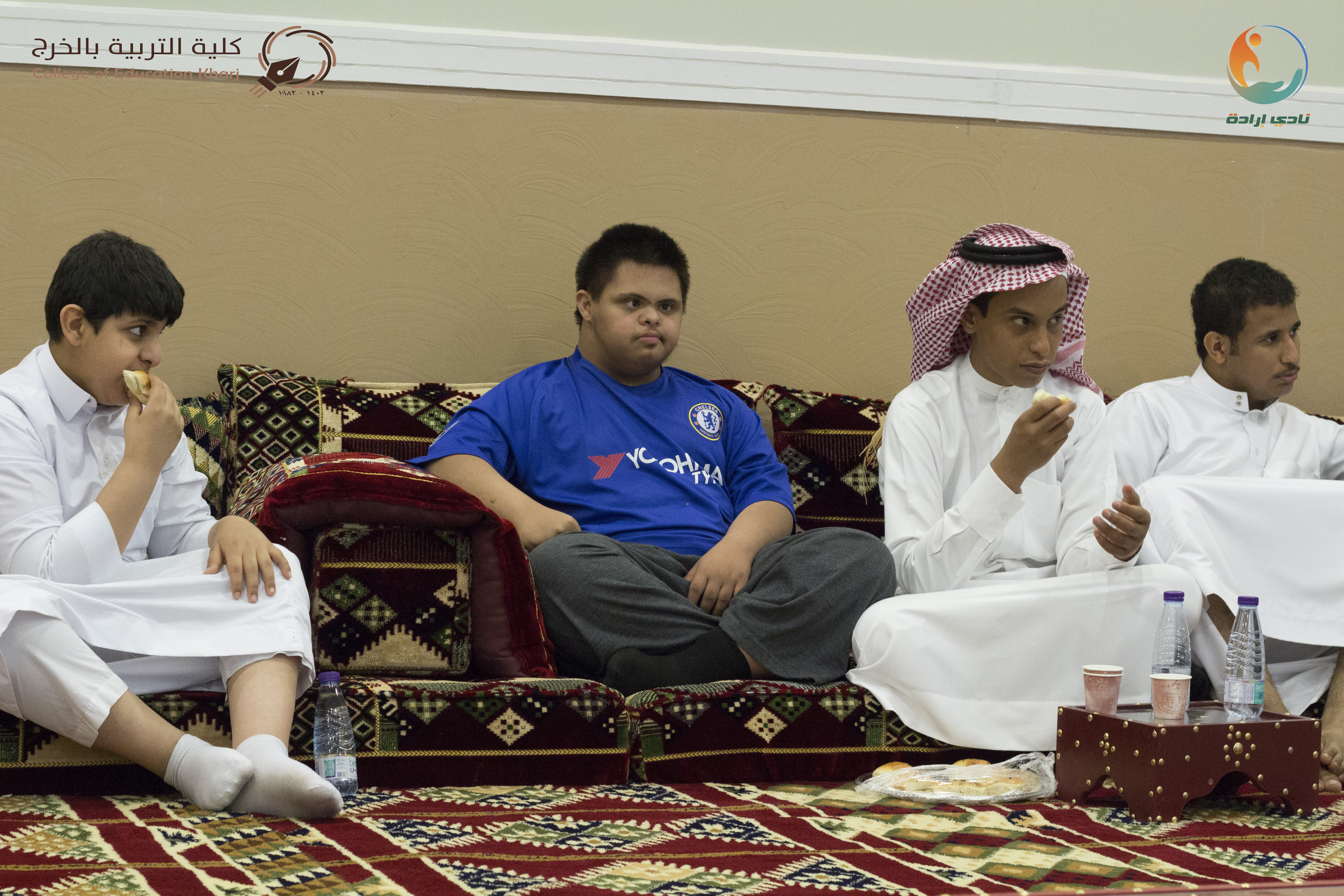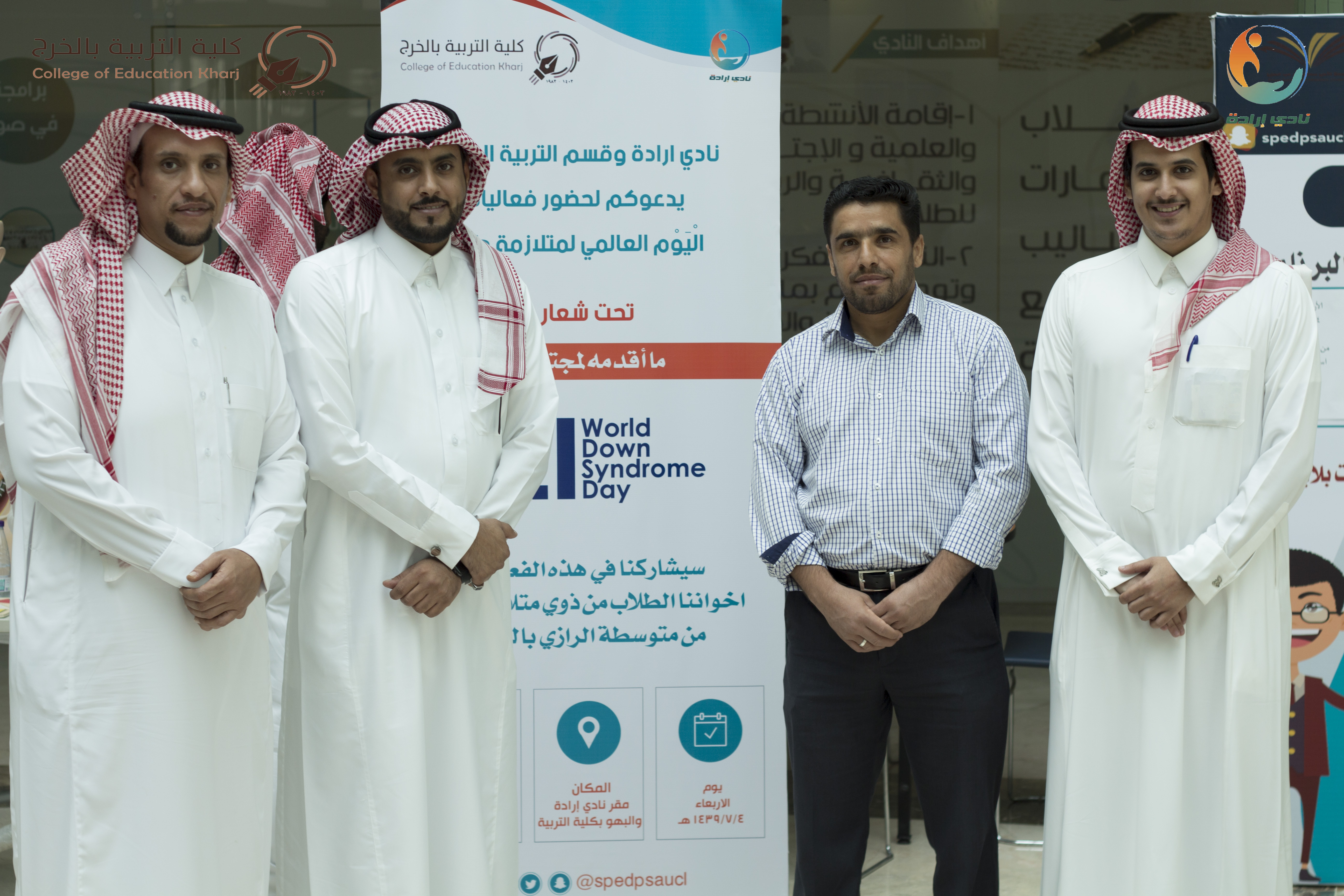 أقام نادي إرادة بكلية التربية بجامعة الأمير سطام بن عبدالعزيز بالخرج بالتعاون مع قسم التربية الخاصة صباح يوم الأربعاء بتاريخ 4 - رجب - 1439 الساعه 10 صباحا فعاليات متنوعة استقبل فيها برنامج التربية الفكرية بمتوسطة الرازي بالخرج وفِي مقدمتهم الأستاذ / ماجد الحمدي والأستاذ / ابراهيم الهليل ومعه عدد من طلاب متلازمة داون للاحتفال باليوم العالمي تحت شعار ( ما أقدمه لمجتمعي ). افتتحت الزيارة بالتعرف على نوع هذه المتلازمة و أسئلة مابين طلاب الجامعة و طلاب متوسطة الرازي. كما أقيم ركن تعليمي للطلاب الميداني و انشطة تربوية وفعاليات ترفيهية واختتمت الفعالية بتقديم هدايا للطلاب متلازمة داون.