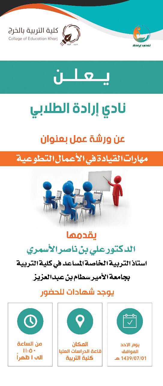 ضمن برامج نادي إرادة الطلابي بكلية التربية بالخرج المتنوعة قدم سعادة الدكتور علي بن ناصر الاسمري عضو هيئة التدريس بكلية التربية ورشة عمل بعنوان