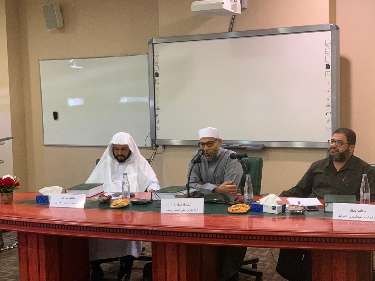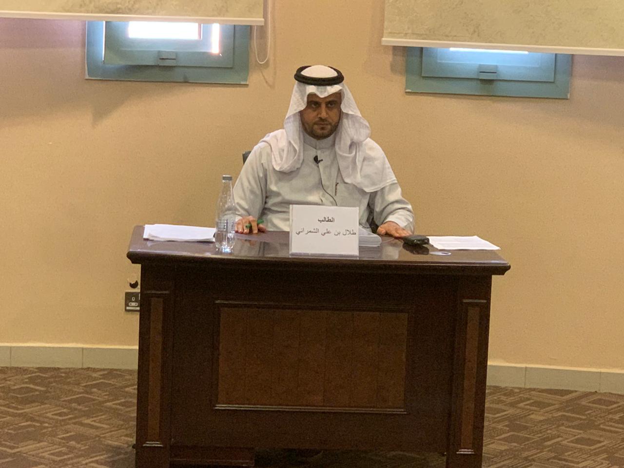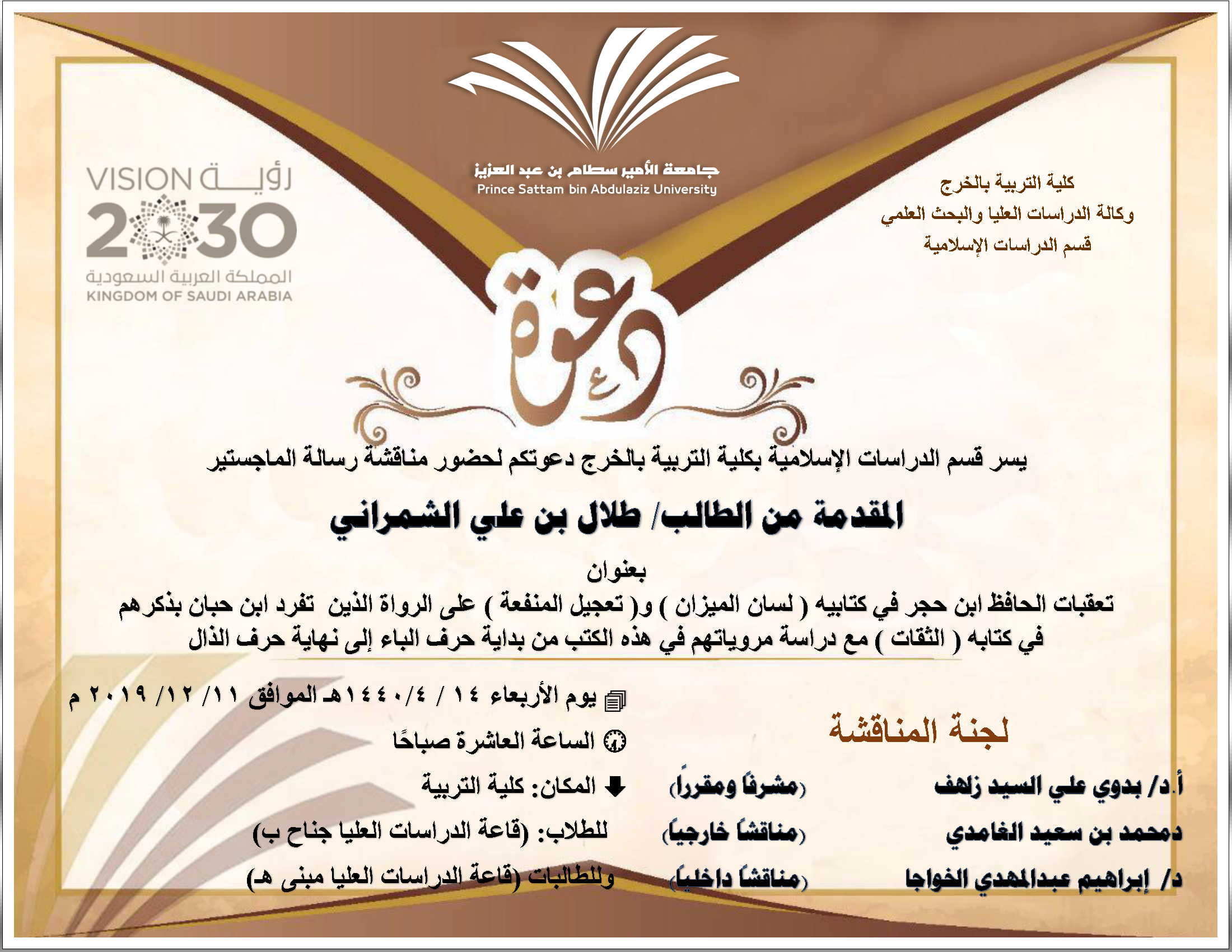 ناقش قسم الدراسات الإسلامية بكلية التربية بالخرج رسالة ماجستير بالقسم بعنوان " تعقبات الحافظ ابن حجر في كتابيه (لسان الميزان) و(تعجيل المنفعة) على الرواة الذين تفرد ابن حبان بذكرهم في كتابيه مع دراسة مروياتهم في هذه الكتب من بداية حرف الباء إلى نهاية حرف الذال" ، المقدمة من الطالب / طلال بن علي الشمراني ، وذلك في يوم الأربعاء 1441/4/14هـ الموافق 2019/12/11م في تمام الساعة العاشرة صباحًا.