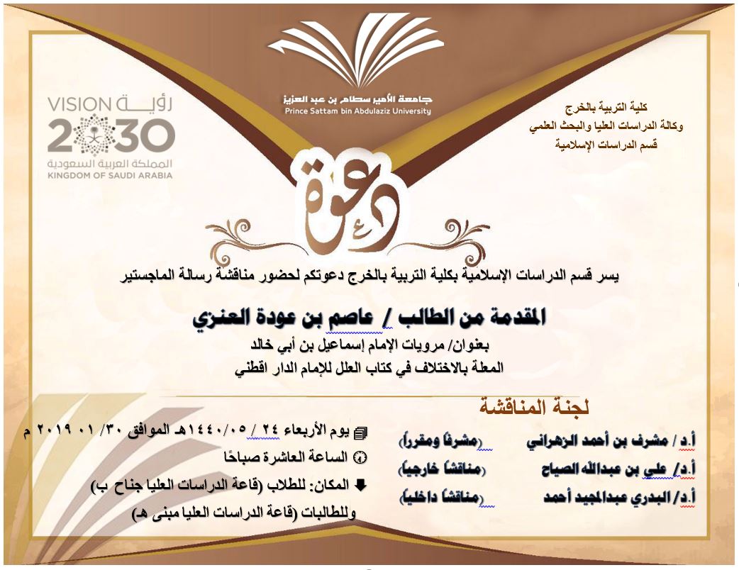 ناقش قسم الدراسات الإسلامية بكلية التربية بالخرج رسالة ماجستير بعنوان / مرويات الإمام إسماعيل بن آبي خالد المعلة بالاختلاف في كتاب العلل للإمام الدار اقطني، المقدمة من الطالب / عاصم بن عودة العنزي، وذلك في يوم الأربعاء الموافق ١٤٤٠/٥/٢٤ هـ في تمام الساعة العاشرة صباحاً بقاعة الدراسات العليا بكلية التربية (جناح ب للطلاب / مبنى هـ للطالبات)
