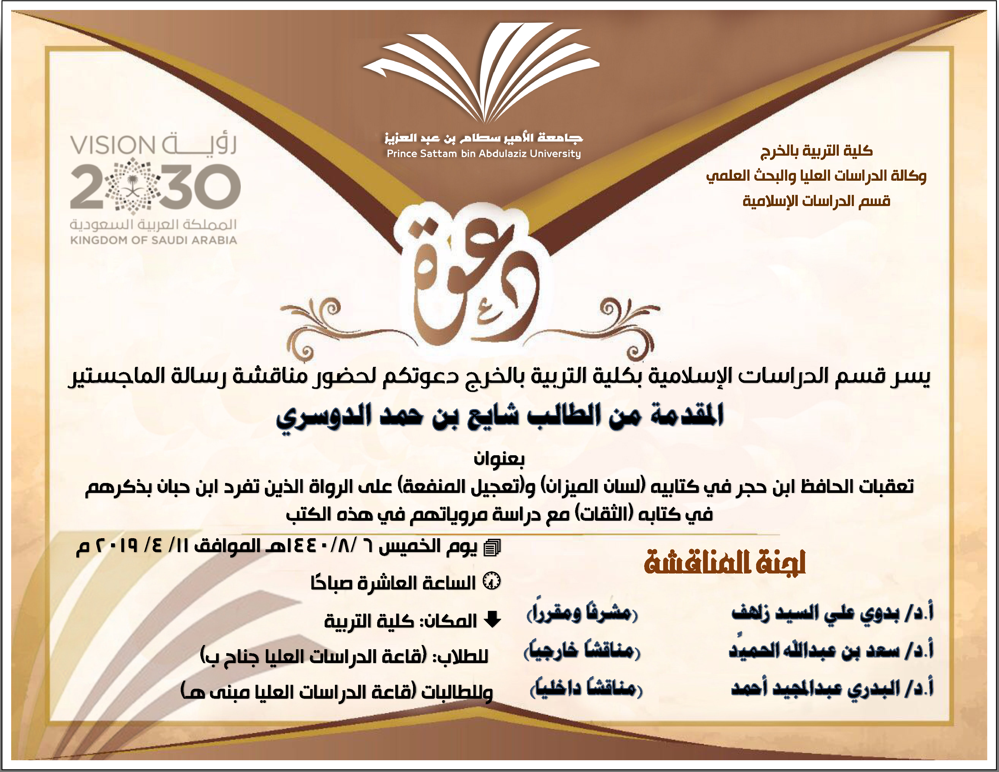 ناقش قسم الدراسات الإسلامية بكلية التربية بالخرج رسالة ماجستير بعنوان / تعقبات الحافظ ابن حجر في كتابيه (لسان الميزان) و(تعجيل المنفعة) على الرواة الذين تفرد ابن حبان بذكرهم في كتابه (الثقات) مع دراسة مروياتهم في هذه الكتب، المقدمة من الطالب / شايع بن حمد الدوسري، وذلك في يوم الخميس 1440/8/6 هـ الموافق 2019/4/11 م في تمام الساعة العاشرة صباحاً بقاعة الدراسات العليا بكلية التربية (جناح ب للطلاب / مبنى هـ للطالبات).