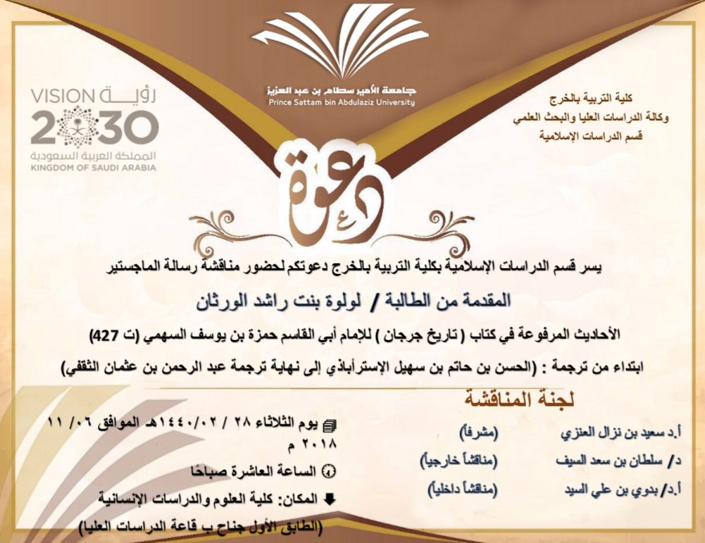 ناقش قسم الدراسات الإسلامية رسالة ماجستير بعنوان / الأحاديث المرفوعة في كتاب (تاريخ جرجان) للإمام أبي القاسم حمزة بن يوسف السهمي (ت 427) ابتداء من ترجمة: (الحسن بن حاتم بن سهيل الإسترأباذي الى نهاية ترجمة عبد الرحمن بن عثمان الثقفي) تخريجاً ودراسة، وذلك في يوم الثلاثاء الموافق 1440/2/28هـ في تمام الساعة العاشرة صباحا بقاعة الدارسات العليا بكلية العلوم والدراسات الإنسانية (الطابق الأول جناح ب للطلاب )
