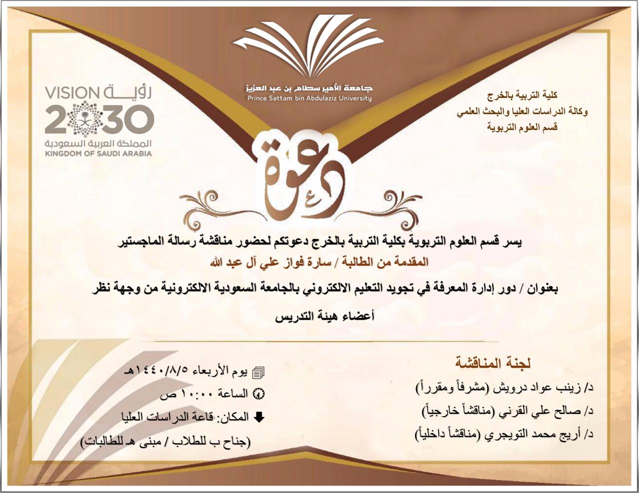 ناقش قسم العلوم التربوية بكلية التربية بالخرج رسالة ماجستير بعنوان / دور إدارة المعرفة في تجويد التعليم الإليكتروني بالجامعة السعودية الإليكترونية من وجهة نظر أعضاء هيئة التدريس، المقدمة من الطالبة / سارة فواز على آل عبدالله، وذلك في يوم الأربعاء 1440/8/5هـ الموافق 2019/4/10 م في تمام الساعة العاشرة صباحاً بقاعة الدراسات العليا بكلية التربية (جناح ب للطلاب / مبنى هـ للطالبات).