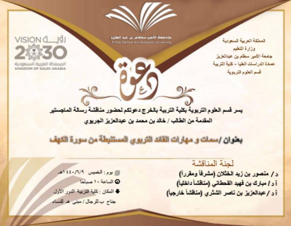 ناقش قسم العلوم التربوية بكلية التربية بالخرج رسالة ماجستير بعنوان / سمات ومهارات القائد التربوي المستنبطة من سورة الكهف، المقدمة من الطالب / خالد بن محمد بن عبد العزيز الجريزي ، وذلك في يوم الخميس الموافق 1440/6/9هـ في تمام الساعة العاشرة صباحاً بقاعة الدراسات العليا بكلية التربية (جناح ب للرجال / مبنى هـ للنساء).