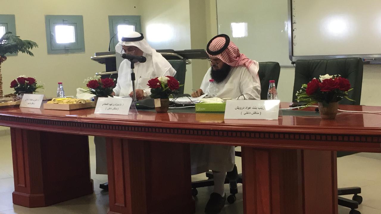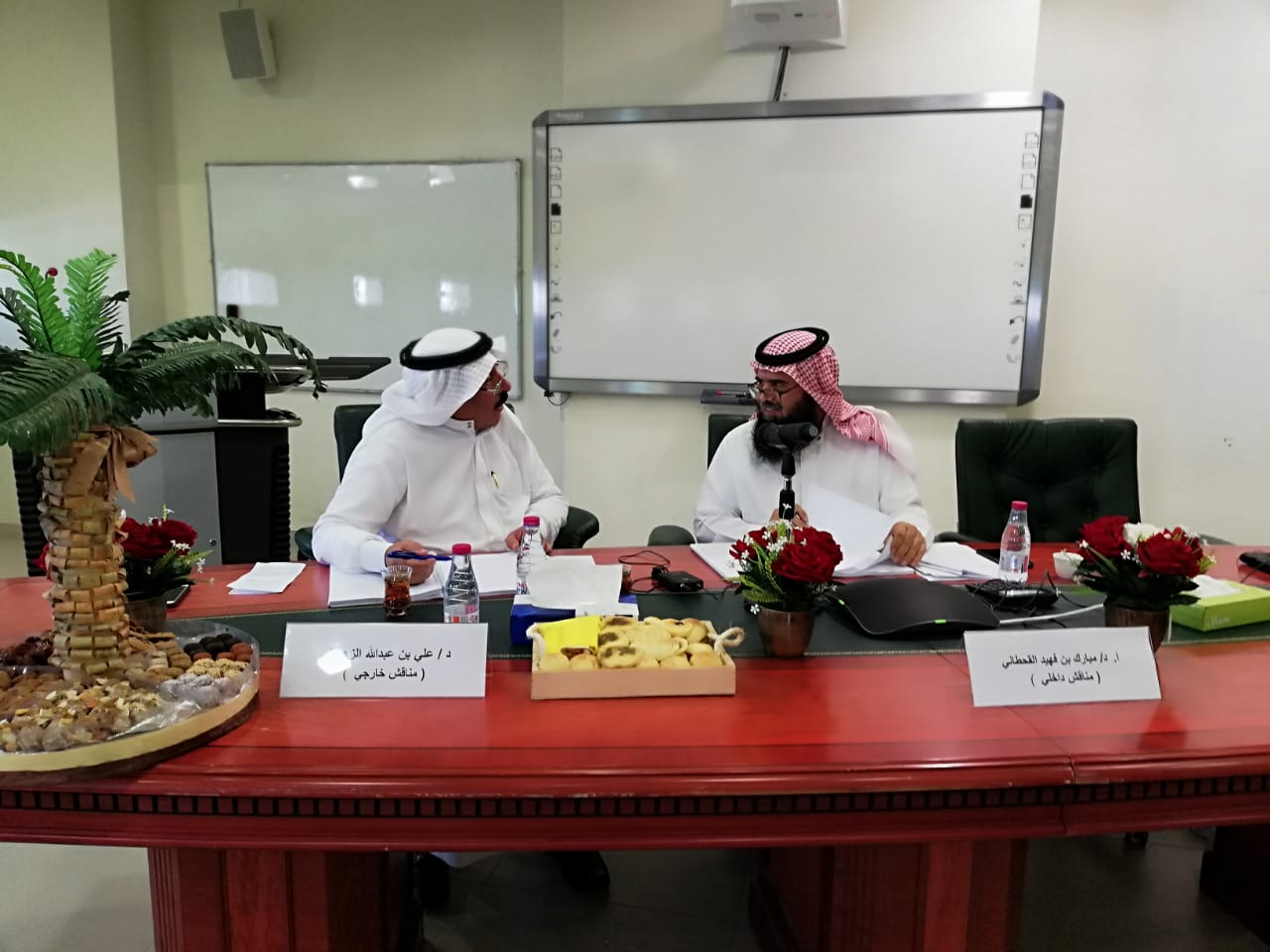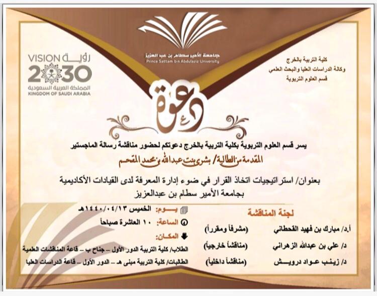 ناقش قسم العلوم التربوية بكلية التربية بالخرج رسالة ماجستير بعنوان / استراتيجيات اتخاذ القرار في ضوء إدارة المعرفة لدى القيادات الأكاديمية بجامعة الأمير سطام بن عبد العزيز، المقدمة من الطالبة / بشرى بنت عبدالله بن محمد المقحم، وذلك في يوم الخميس الموافق 1440/4/13هـ في تمام الساعة العاشرة صباحاً بقاعة المناقشات العلمية بكلية التربية – الدور الأول ( للطلاب ) ، وقاعة الدراسات العليا بكلية التربية مبنى هـ - الدور الأول (للطالبات)