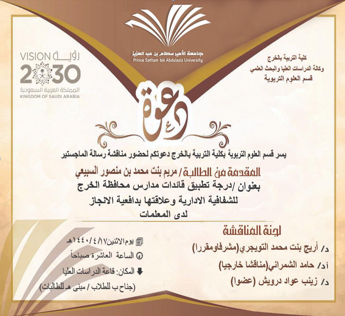 ناقش قسم العلوم التربوية بكلية التربية بالخرج رسالة ماجستير بعنوان / درجة تطبيق قائدات مدارس محافظة الخرج للشفافية الإدارية وعلاقتها بدافعية الإنجاز لدى المعلمات، المقدمة من الطالبة / مريم بنت محمد بن منصور السبيعي، وذلك في يوم الإثنين الموافق 1440/4/17هـ في تمام الساعة العاشرة صباحاً بقاعة الدراسات العليا بكلية التربية (جناح ب للطلاب / مبنى هـ للطالبات)