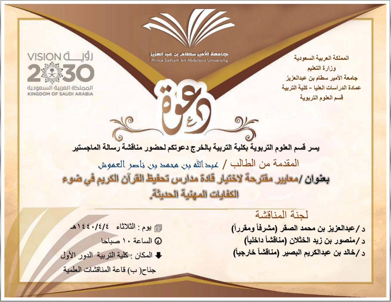 ناقش قسم العلوم التربوية بكلية التربية بالخرج رسالة ماجستير بعنوان / معايير مقترحة لاختيار قادة مدارس تحفيظ القرآن الكريم في ضوء الكفايات المهنية الحديثة ، المقدمة من الطالب / عبد الله بن محمد بن ناصر العموش ، وذلك في يوم الثلاثاء الموافق 1440/4/14هـ في تمام الساعة العاشرة صباحاً بقاعة المناقشات العلمية بكلية التربية الدور الأول (جناح ب)