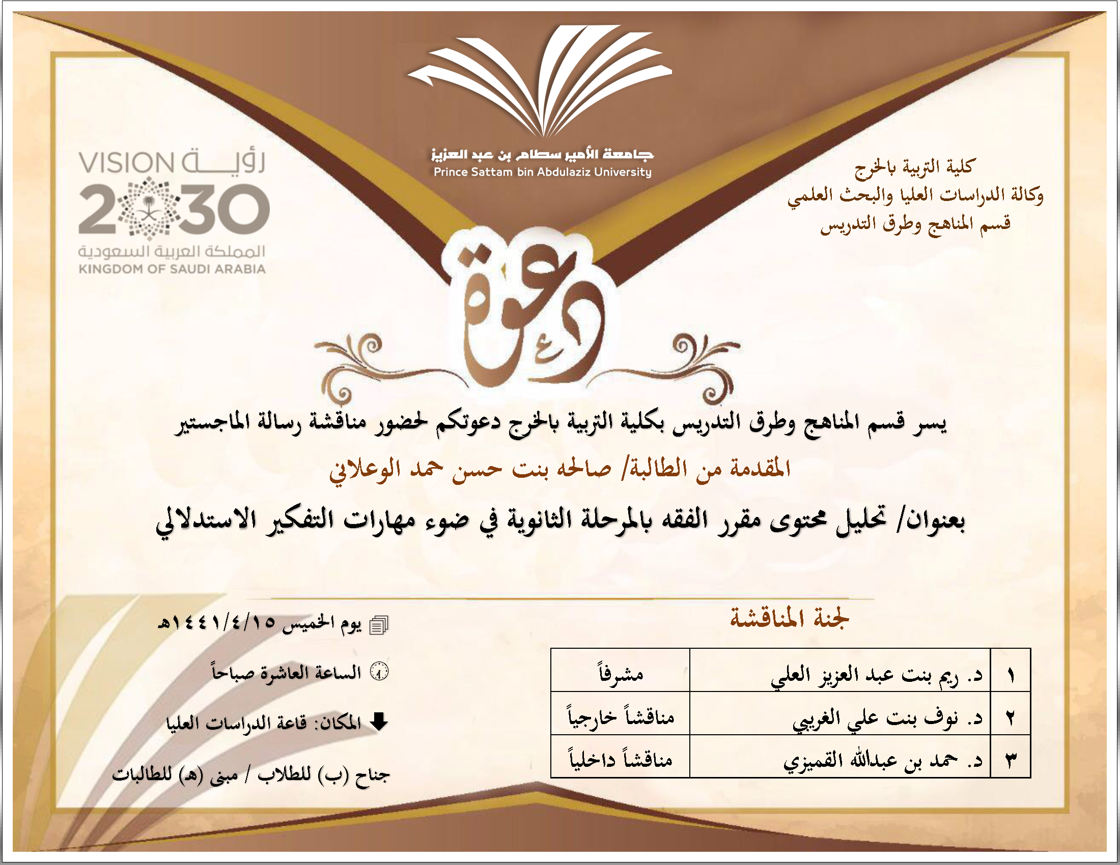 ناقش قسم المناهج وطرق التدريس بكلية التربية بالخرج رسالة ماجستير بعنوان "تحليل محتوى مقرر الفقه بالمرحلة الثانوية في ضوء مهارات التفكير الاستدلالي"، المقدمة من الطالبة / صالحة بنت حسن حمد الوعلاني، وذلك في يوم الخميس ١٤٤١/٤/١٥هـ الموافق ٢٠١٩/١٢/١٢م في تمام الساعة العاشرة صباحًا بقاعة الدراسات العليا بكلية التربية (جناح ب للطلاب / مبنى هـ للطالبات).