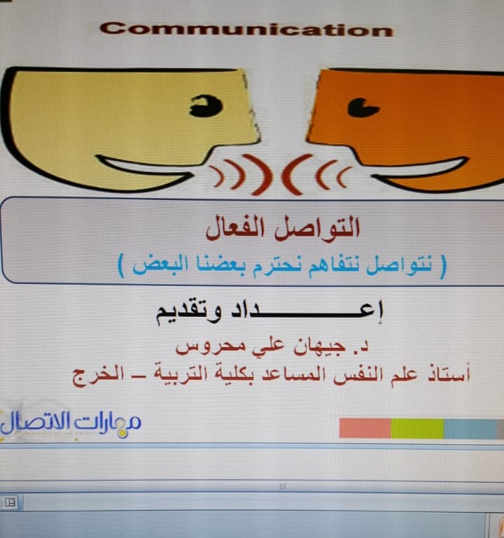 نفذ قسم علم النفس محاضرة بعنوان (التواصل الفعال) قدمتها د. جيهان علي محروس بكلية التربية بالخرج يوم الأحد الموافق١/ ٣/ ١٤٤٠هـ تحت رعاية وكيلة الكلية للشؤون التعليمية والأكاديمية د. منيرة العسكر وبالتعاون مع وحدة النشاط الطلابي، وبحضور عدد من طالبات الكلية، وهدفت الفعالية إلى التعرف على وسائل التواصل الفعال ؛ وتميز عدد من طرق التواصل الكتروني الفعال في التفاهم والمتابعة الحوار البناء ؛ والتميز المهاري باستخدام تلك الوسائل لزياة التواصل الايجابي بين الأساتذة وبين الطالبات .