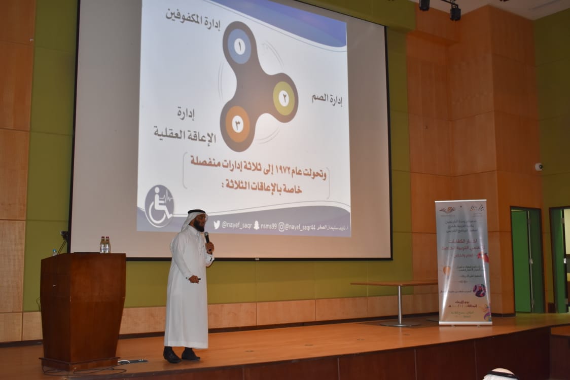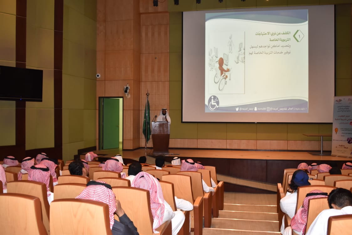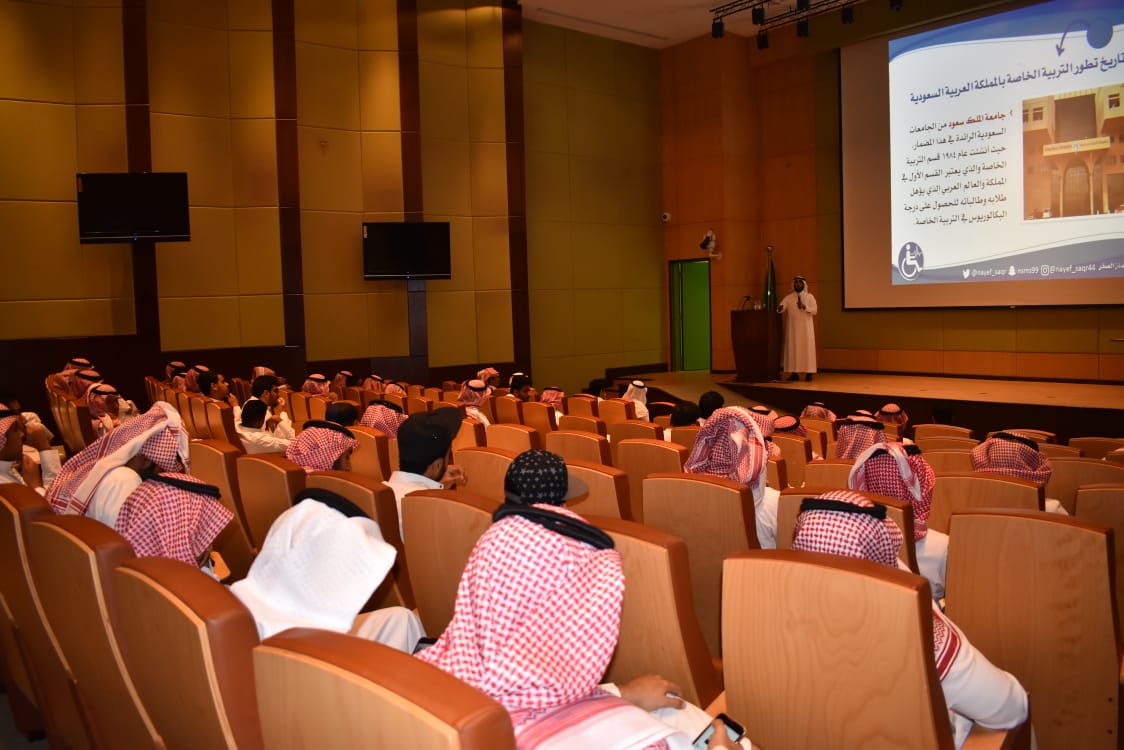 نظمت كلية التربية بالخرج ممثلة بوحدة الخريجين دورة بعنوان اختبار الكفايات لمعلمي التربية الخاصة قدمها المدرب نايف بن سليمان الصقر يوم الأربعاء ١٣-٣-١٤٤٠ وذلك على مسرح الكلية. تناول فيها استراتيجيات ومعايير الاختبار، وأمثلة تطبيقية على تلك المعايير. كما قام المدرب بإهداء المتدربين حقيبة تدريبية وكتيب يتضمن نماذج لأسئلة الاختبار. وفي الختام كرم سعادة الدكتور مبارك آل وزره وكيل الكلية للدراسات العليا وسعادة الأستاذ صالح العرجاني رئيس وحدة الخريجين المدرب نايف الصقر، مثمنين له جهوده ومشاركته للأنشطة الجامعة .