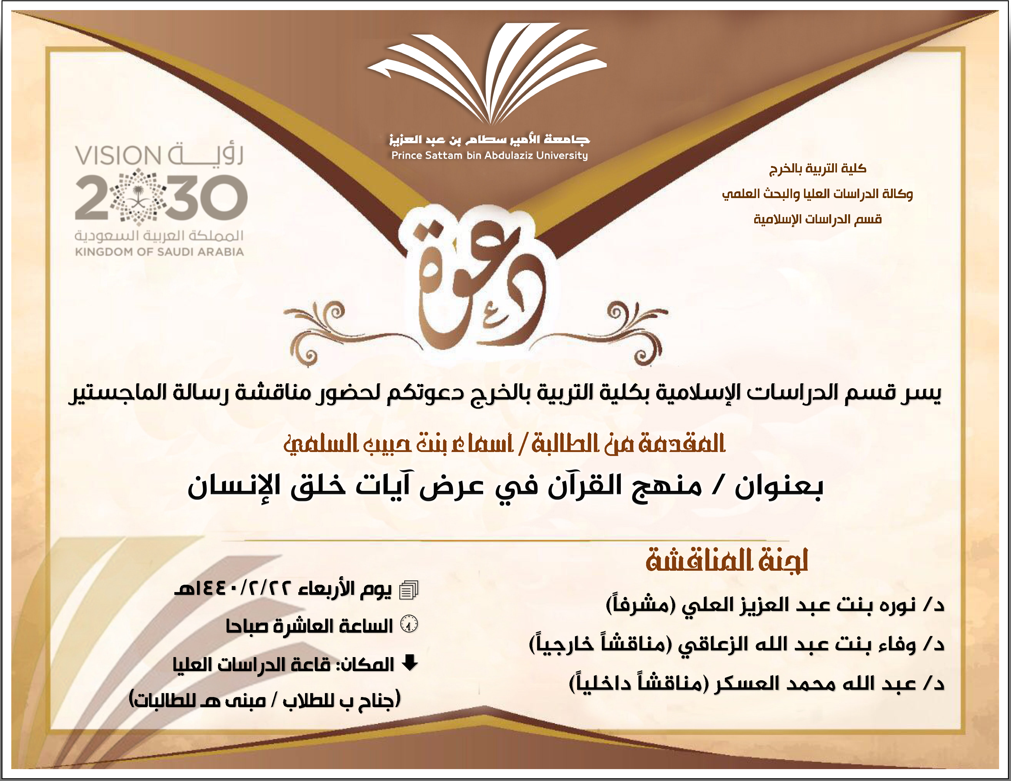 يناقش قسم الدراسات الإسلامية رسالة ماجستير بعنوان/ منهج القرآن في عرض آيات خلق الإنسان للطالبة / أسماء بنت حبيب السلمي وذلك فى يوم الأربعاء الموافق 1440/2/22هـ فى تمام الساعة العاشرة صباحا بقاعة الدارسات العليا بكلية التربية (جناح ب للطلاب / مبنى هـ للطالبات)