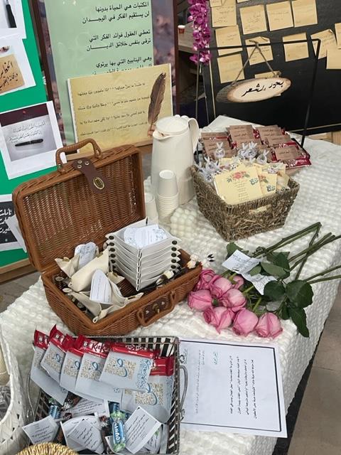 شمل المعرض على أركان متعددة شاركت فيها الطالبات بالحديث عن الشعر العربي قديمه وحديثه، وعرض نماذج من شعر شعراء العربية وشاعراتها عبر العصور الأدبية المختلفة، وكذلك التنوع الجغرافي والإقليمي في المملكة ومارافقه من تنوع ثقافي وإثراء أدبي وفكري، وشملت أركان جيزان والقصيم والأحساء ومكة وابها وجدة والرياض وحائل على مزيج من تراث المنطقة والحديث عن أدبها، كما حوى ركن اللهجات العربية على تعريف بها وأهم القبائل الناطقة بها سبب نشأتها وتحولاتها.