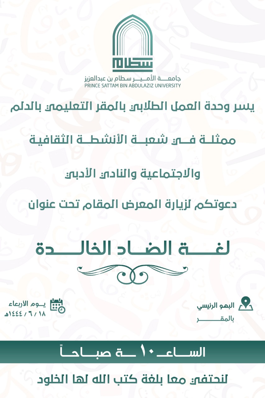 تفخر الأمم والشعوب بموروثها الثقافي والحضاري والذي يتضمن مايحمله التاريخ ونطقت به الايام من المعارف والعلوم والآداب والثقافات، ومن الأصالة التي تميز عالمنا العربي والإسلامي لغة الضاد التي شرفها الله سبحاته وتعالى فكانت هي لغة القرآن الكريم ؛ فكتب لها الخلود مادام هناك قرآن يقرأ، وحرصا من قسم اللغة العربية بكلية التربية بالمقر التعليمي بالدلم على الاحتفاء بهذه اللغة العالمية افتتحت سعادة وكيلة الكلية د. وداد شرعبي والمشرفة على وحدة العمل الطلابي د. مها الخطيب ووكيلة قسم اللغة العربية د. مها العنزي المعرض الذي نظمه القسم عن لغة الضاد الخالدة يوم الأربعاء الثامن عشر من شهر جمادى الأخرة لعام 1444هـ في البهو الرئيسي.