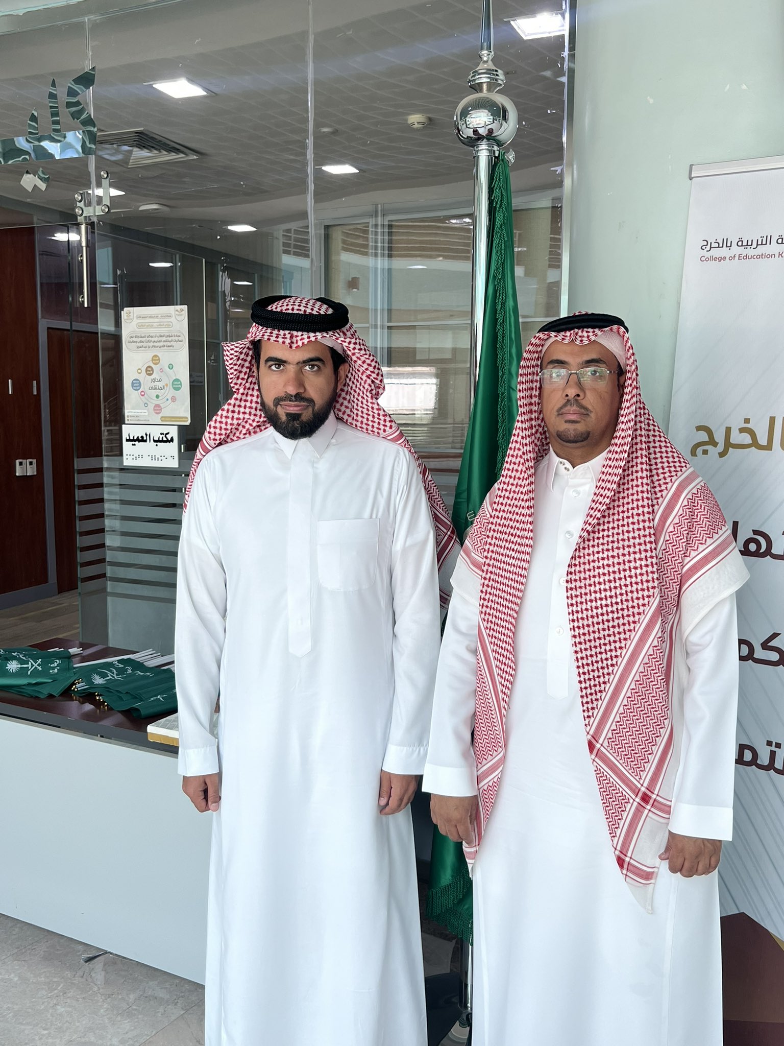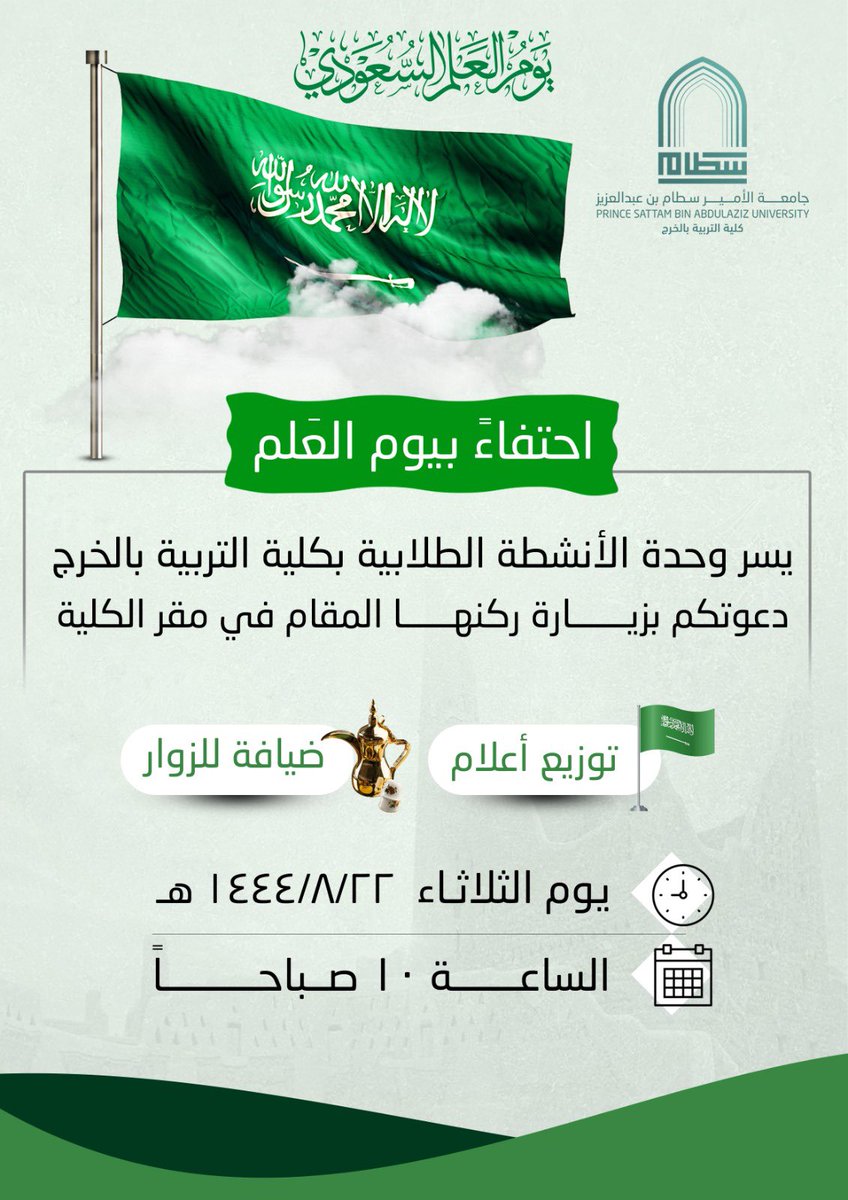 وحدة الأنشطة الطلابية بكلية التربية بالخرج تحتفل بيوم العلم      احتفلت وحدة وحدة الأنشطة الطلابية في كلية التربية بالخرج بيوم العلم مع منسوبي الجامعة، وذلك في يوم الثلاثاء الموافق 22/8/ 1444هـ الساعة 10 صباحًا.     حيث أقامت ركن مخصص لتوزيع الأعلام، وتقديم ضيافة للزوار.