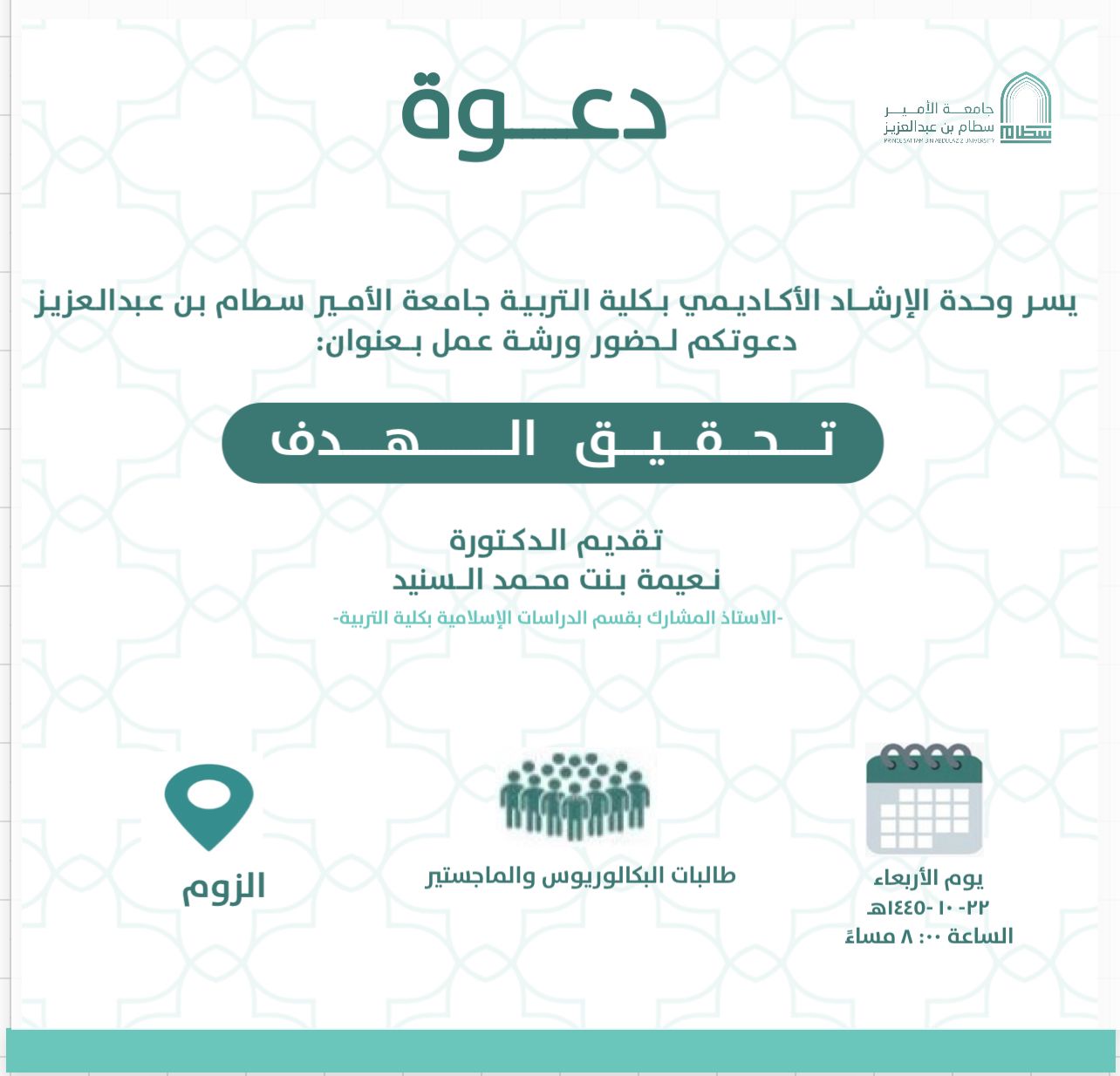 نظمت وحدة الإرشاد بالكلية ورشة بعنوان " تحقيق الهدف "وذلك مساء يوم الأربعاء الثاني والعشرون من شهر شوال لعام 1445هـ عبر الزوم.