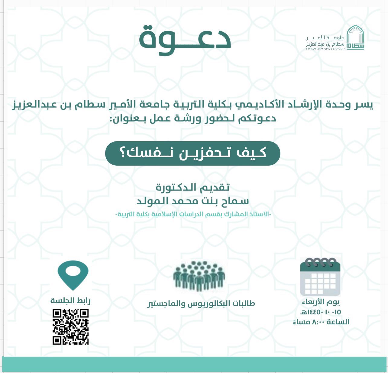 قدمته الدكتورة/سماح المولد-الاستاذ المشارك بقسم الدراسات الاسلامية-ويهدف اللقاء إلى: معرفة كيف يحفز المرء نفسه و بيان معنى التحفيز- أهميته- أنواعه ومتى نتحرك لتحفيز أنفسنا أساليب التحفيز وكيفية الوصول إليه