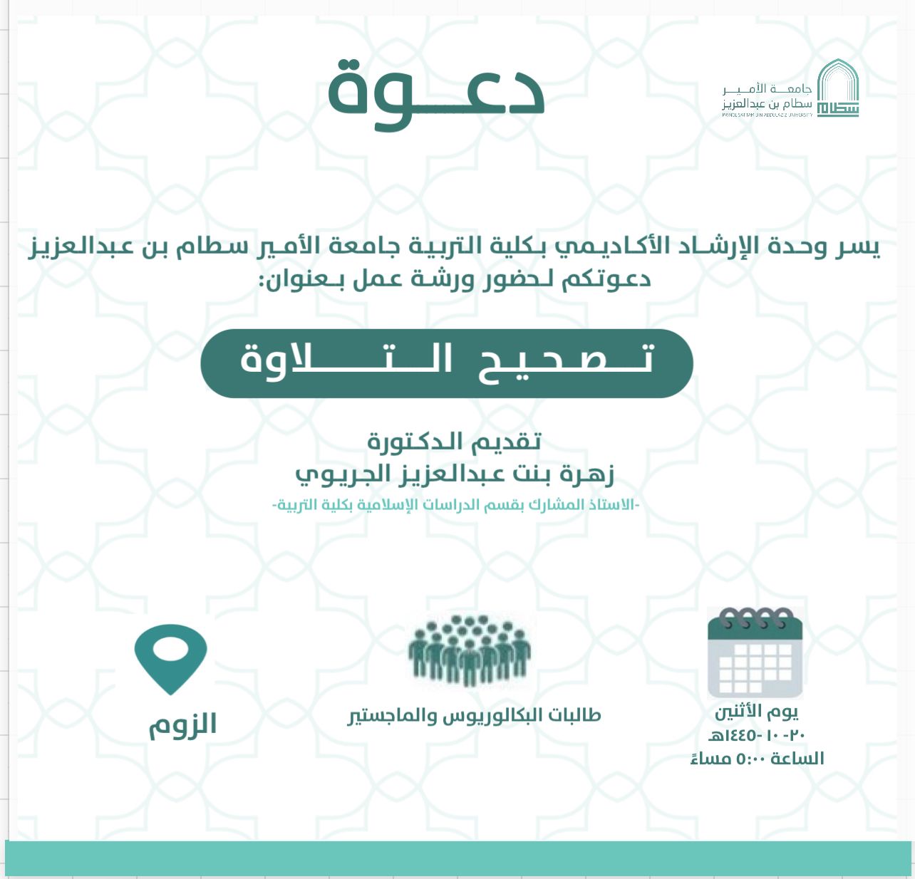 نظمت وحدة الإرشاد بالكلية محاضرة بعنوان "تصحيح التلاوة" وذلك مساء يوم الأثنين العشرون من شهر شوال لعام 1445هـ عبر الزوم.
