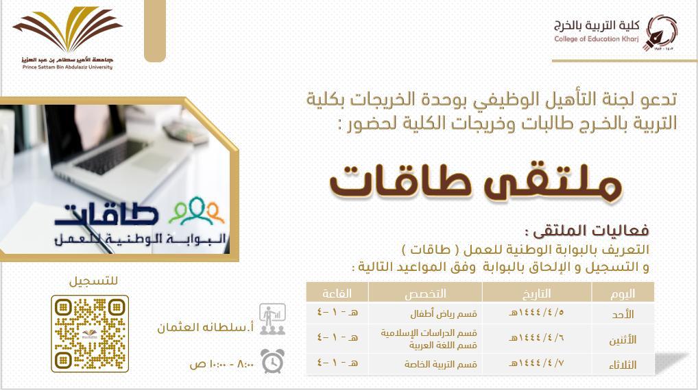 أقامت وحدة الخريجات بكلية التربية بالخرج ممثلة بلجنة التأهيل الوظيفي بملتقى طاقات
