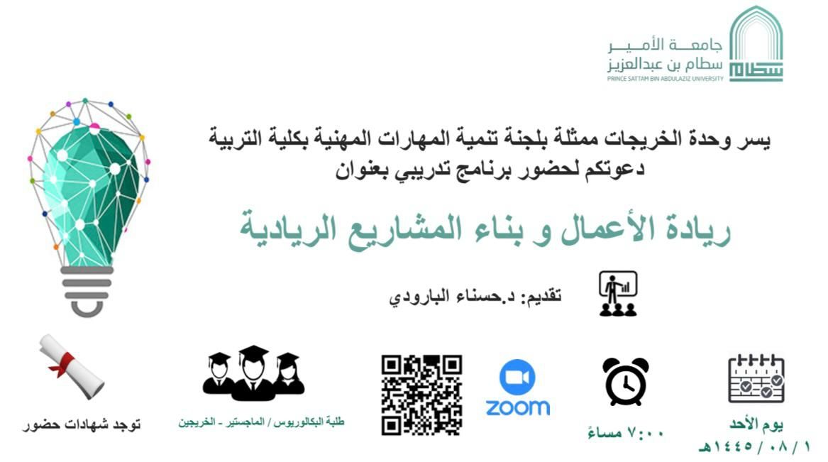نظمت وحدة الخريجات بكلية التربية ممثلة بلجنة تنمية المهارات المهنية برنامجاً تدريبياً استهدف الخريجات والمتوقع تخرجهن ببرامج البكالوريوس والماجستير تحت عنوان: " ريادة الاعمال وبناء المشاريع الريادية " وذلك مساء يوم الأحد 1شعبان لعام 1445هـ عبر الزوم.