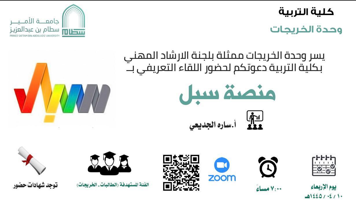 نظمت وحدة الخريجات ممثلة بلجنة الارشاد المهني لقاء تعريفي للخريجات والطالبات المتوقع تخرجهن للتعريف بمنصة سبل قدمتها ممثلة لجنة الارشاد المهني المدربة/ سارة الجديعي ، وذلك مساء يوم الأربعاء10 /4/1445هـ عبر الزوم.