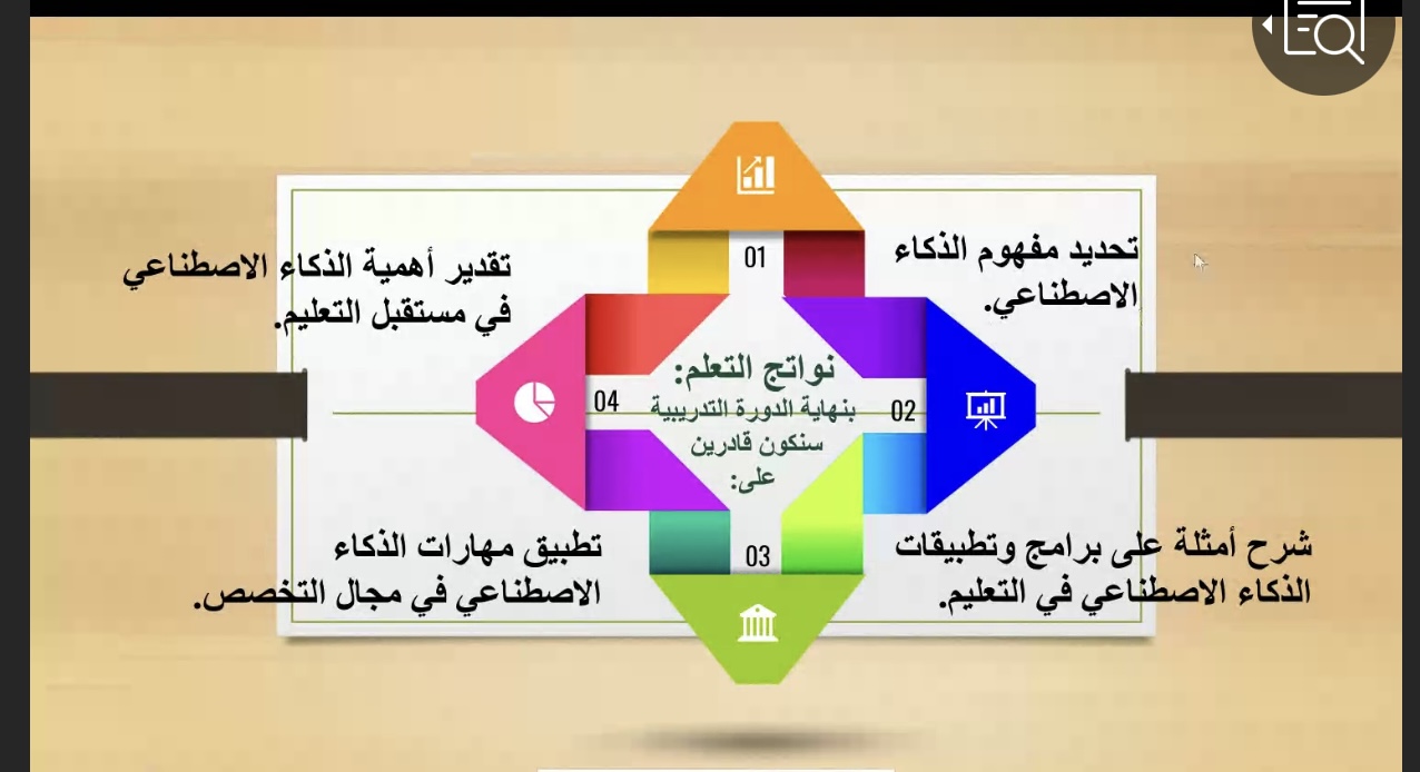 قدمتها الدكتورة/ سحر عبده السيد- أستاذ المناهج وطرق تدريس الرياضيات المشارك-بهدف: تنمية مهارات الطالبات في استخدام تطبيقات الذكاء الاصطناعي في التعليم لضمان جودة مخرجات التعلُم، وذلك من خلال: