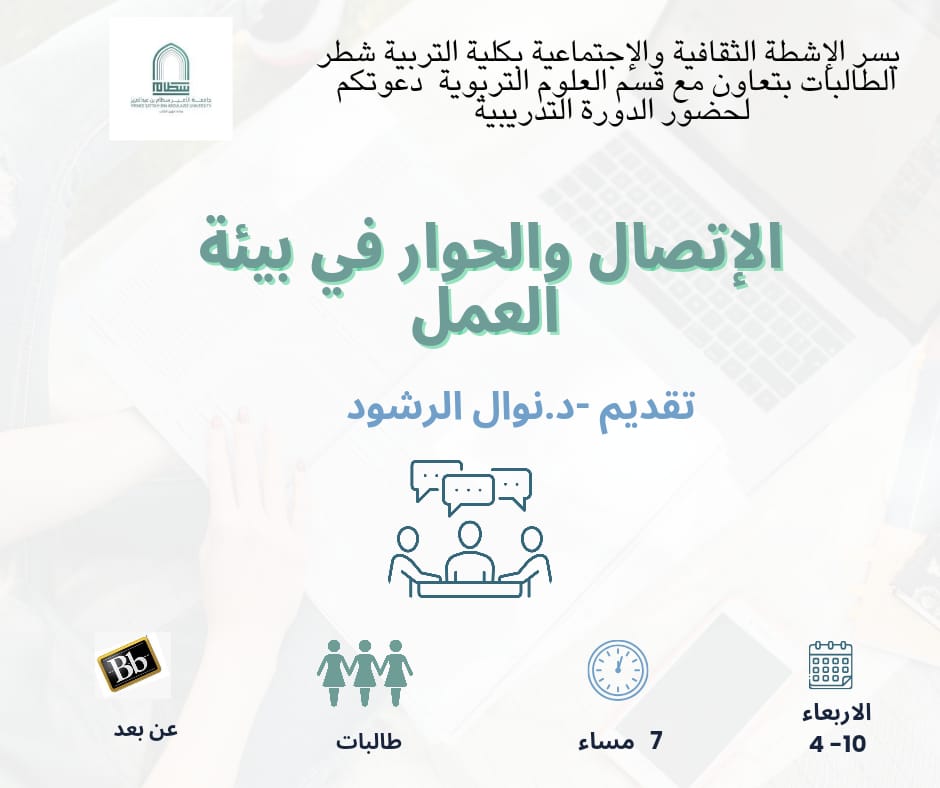 نظمت وحدة العمل الطلابي ممثلة بالأنشطة الثقافية والاجتماعية بالتعاون مع قسم العلوم التربوية دورة تدريبية بعنوان "الاتصال والحوار في بيئة العمل" المنفذة الكترونياً عبر الزوم وذلك مساء يوم الأربعاء العاشر من شهر ربيع الثاني لعام 1445هـ استهدفت طلاب وطالبات جامعة الأمير سطام بن عبد العزيز.