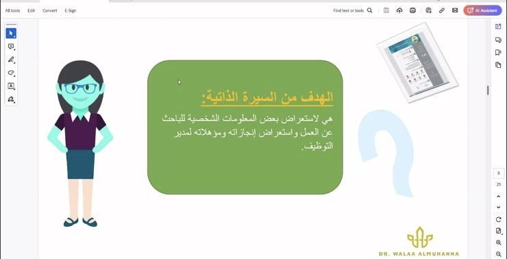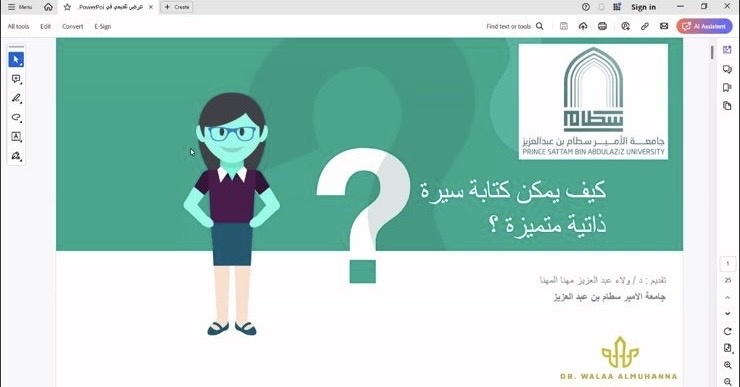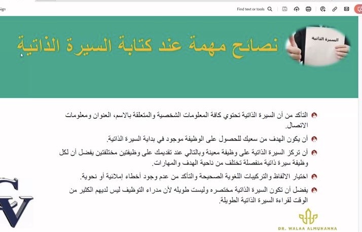 قدمته الدكتورة/ ولاء المهنا ، والهدف من هذه الورشة التدريبية تعريف الحضور بـ ماهي السيرة الذاتية، أنواعها و اٍستخداماتها ،و تحديد محتويات السيرة الذاتية الجيدة ،كتابة سيرتك الذاتية الملائمة لأهدافك الوظيفية.