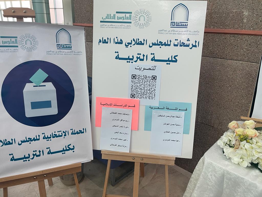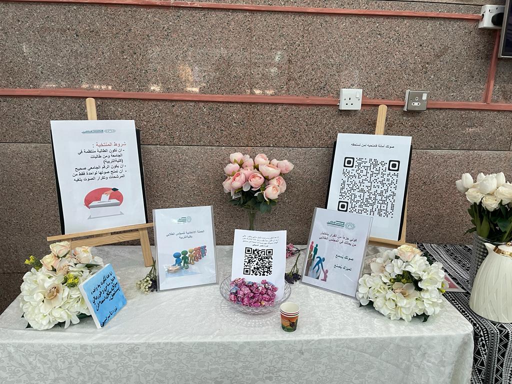 The Student Work Unit, represented by the Student Councils Unit at the college, under the supervision of Mrs. Lulwa Al-Amro - Student Council Coordinator - on Monday, 10- 3- 1445 AH, organized the election campaign for the Student Council for the academic year 1445 AH by preparing the necessary and important designs and publications to form the new council.