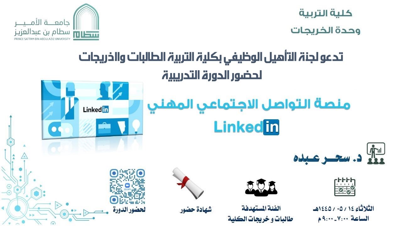 The Alumni Unit at the College of Education, represented by the Career Qualification Committee, presented a training course entitled: (Professional Social Media Platform Linkedin) presented by the Associate Professor of Curricula and Mathematics Education at the College, Dr. Sahar Abdo Elsayed, targeting graduates, and students expected to graduate, on Tuesday evening at 7 pm, corresponding to 5/14/1445 AH, via Zoom program.