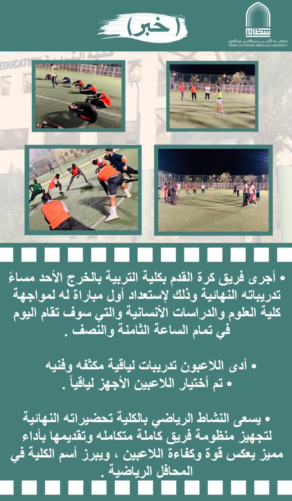 Congratulations to the College of Education football team members for their victory (4-2) over their counterparts in the College of Science and Humanities in Al-Kharj