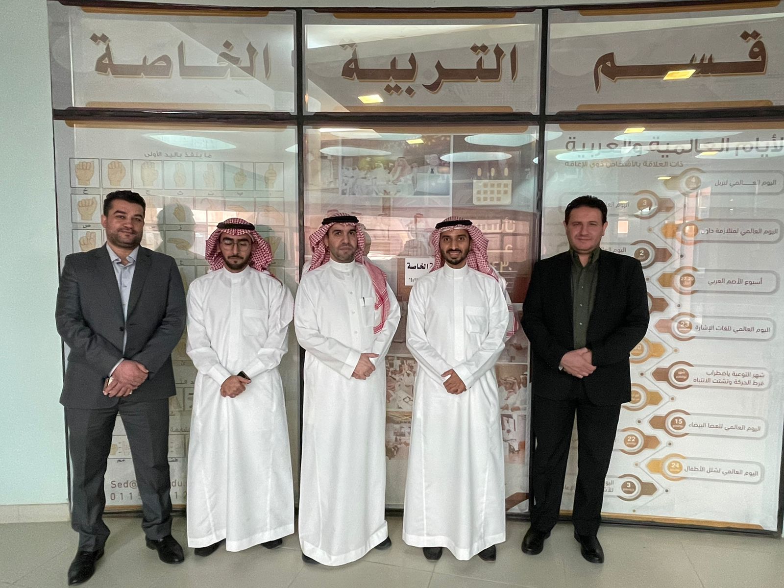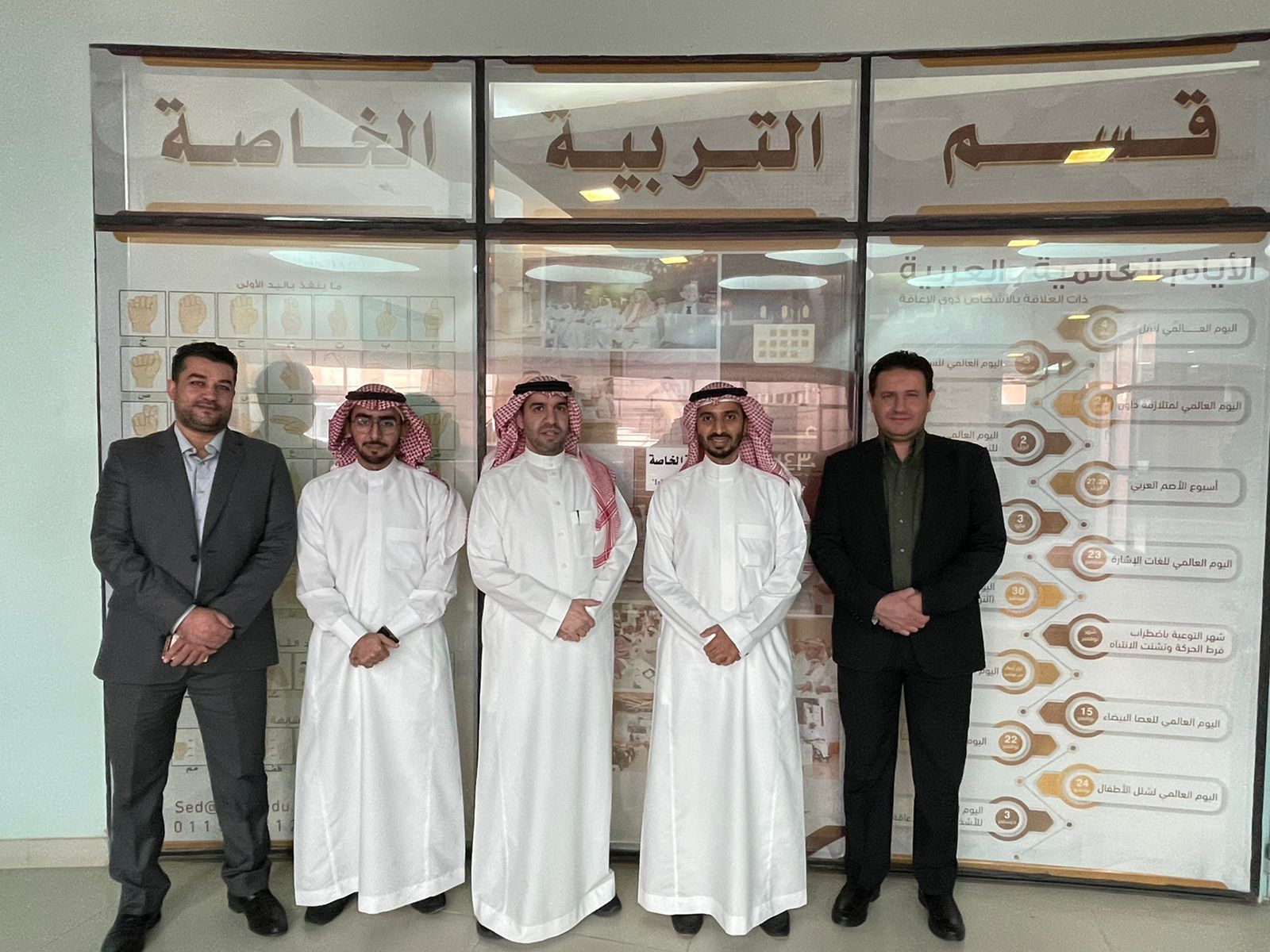 A delegation from Imam Abdulrahman bin Faisal University on an official visit to the Department of Special Education, College of Education in Al-Kharj, on Monday, 3/26/1443 AH corresponding to 10/1/2021 AD, to benefit from the department’s qualitative services and experiences in the field of transitional services for persons with disabilities, and sign language translation Teaching sign language to listening students. The delegation was received by Dr. Abdul-Hadi bin Abdullah Al-Omari, Head of the Special Education Department at the College of Education in Al-Kharj. The delegation included Dr. Yusef Abu Saad Al-Jumaiah, Head of the Special Education Department at Prince Abdul Rahman bin Faisal University, and Dr. Samer Muhammad Abu Durai, a faculty member in the department Professor/ Hassan Muhammad Al-Khalil, a faculty member in the department, and Professor/ Ibrahim Fahd Al-Huwaitan, a graduate of Prince Sattam bin Abdulaziz University and a teaching assistant at the Department of Special Education at Prince Abdulrahman bin Faisal University.