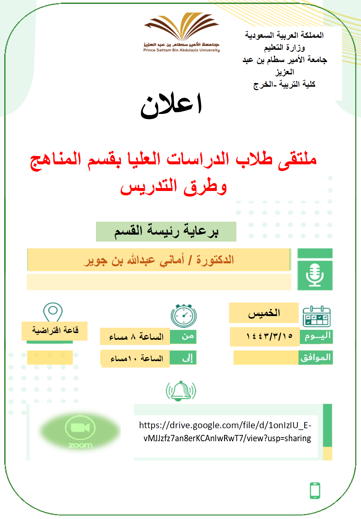 The Curriculum and Instruction Department held the first forum for postgraduate students in the Department of Curriculum and Instruction under the patronage of the Head of the Department, Dr. Amani Abdullah bin Juwer, on Thursday, March 15, 1443 AH, from eight to ten in the evening.