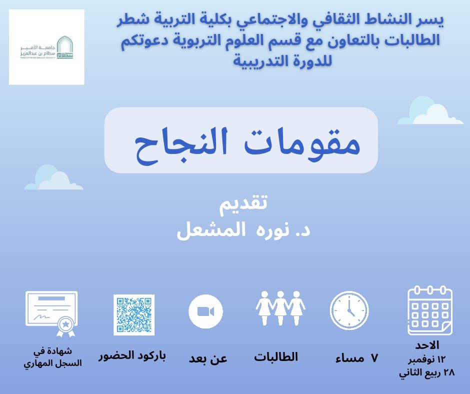 The Student Work Unit, represented by the Cultural and Social Activities Division, in cooperation with the Department of Educational Sciences, organized a training course targeting female students entitled: (Ingredients for Success) on Sunday, 4/28/1445 AH, via Zoom.