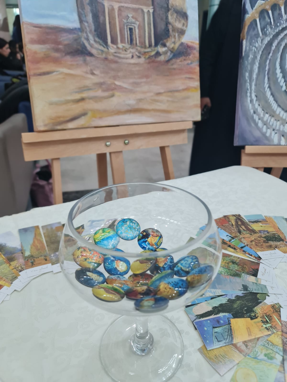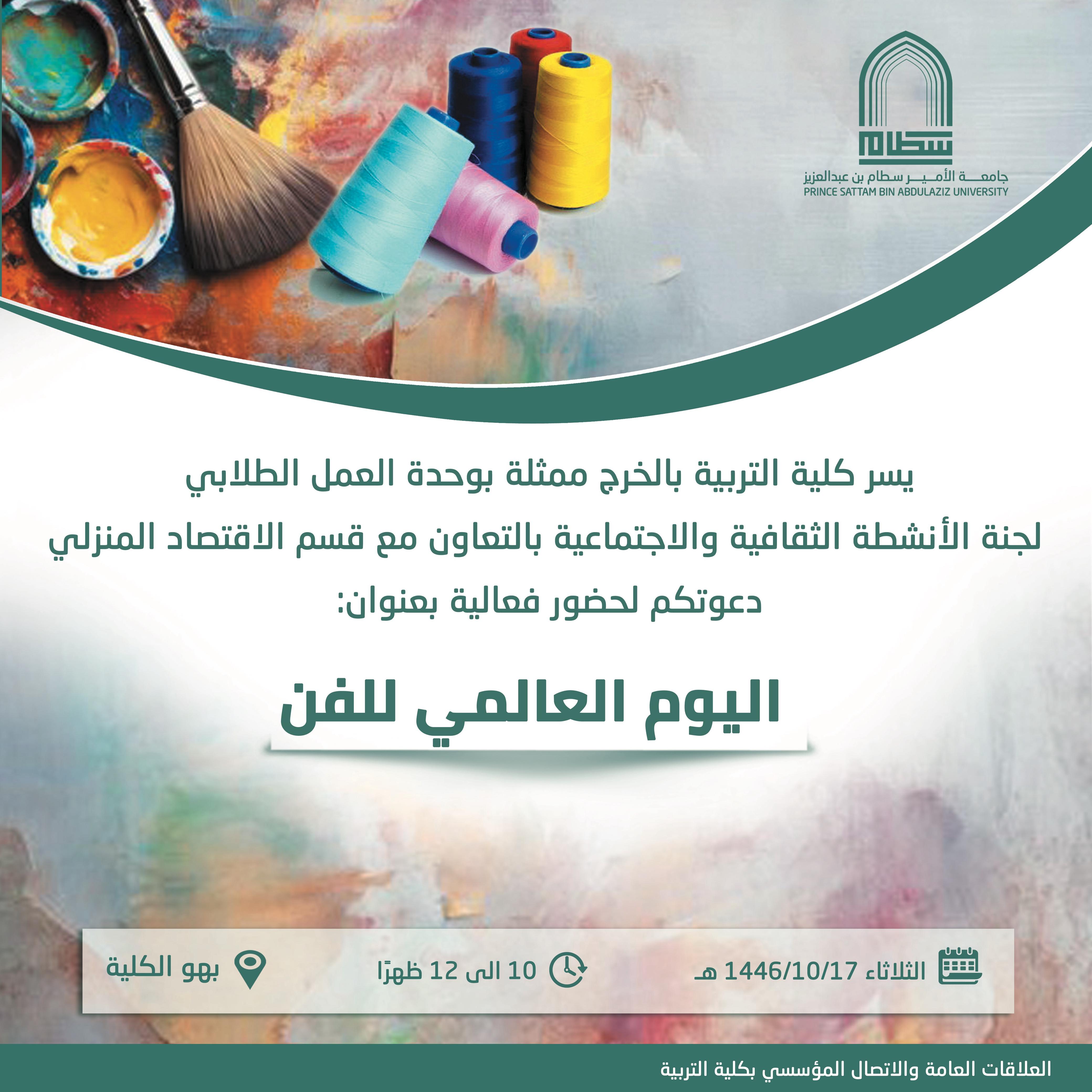 In the presence of the Vice Dean of the College of Education for Educational and Academic Affairs, Dr. Munira Abdullah Saleh Al-Askar, and several college employees, the College of Education, represented by the Student Work Unit- the Cultural and Social Activities Committee, in cooperation with the Department of Home Economics, celebrated International Day of Art in the college’s internal courtyard on Tuesday, 10/17/1446 AH.